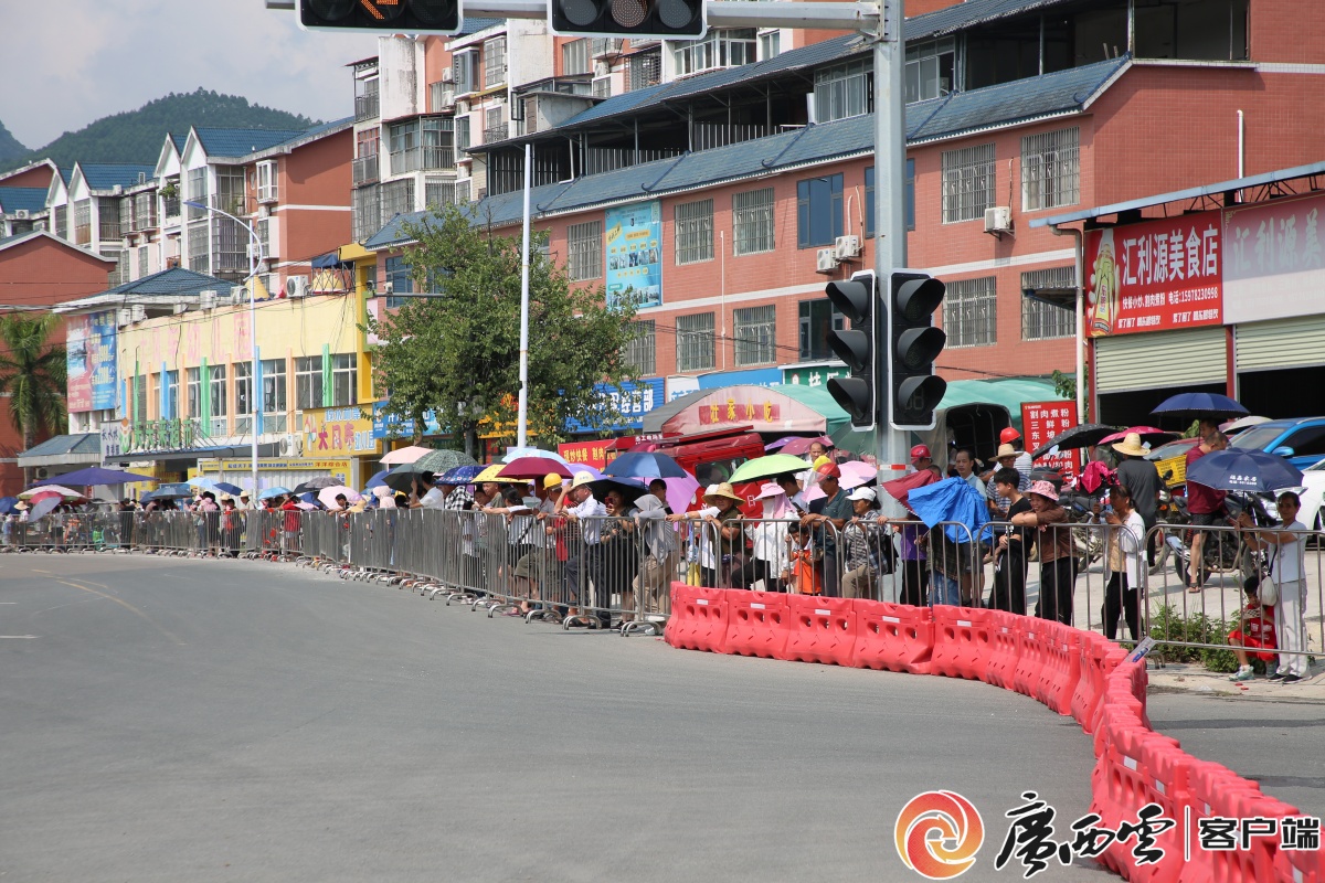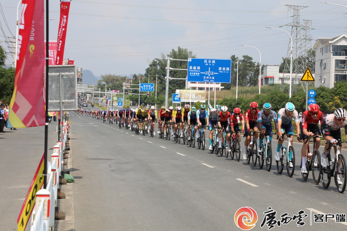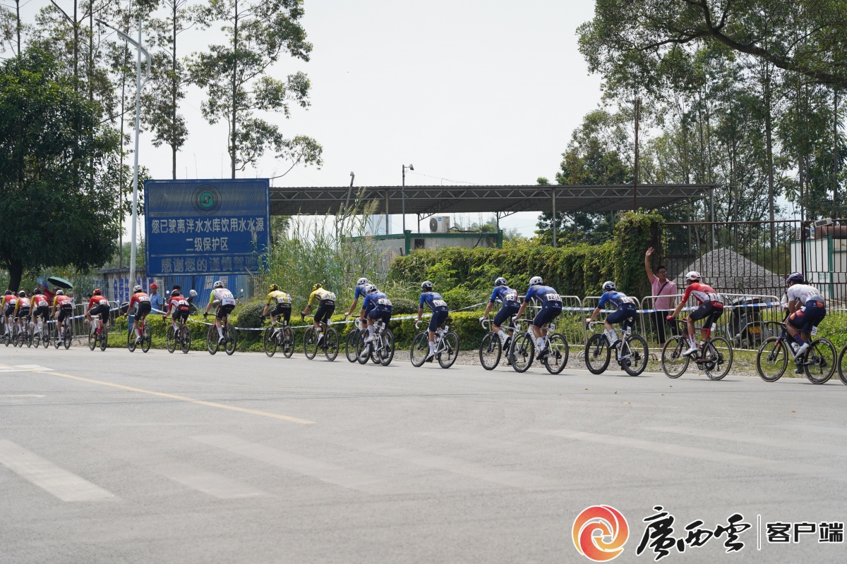 沿途觀眾聚集。 清晨9時未至,國道沿線已聚滿翹首以盼的觀眾。有人搬著小凳子占據最佳觀賽位,有人牽著孩子的手踮腳張望,還有人舉著自制的加油牌,每個人的臉上都寫滿期待。人群中89歲的藍翠娥奶奶尤為引人注目。“很高興在家門口能看到國際大賽,特意叫上老姐妹一起來沾沾熱鬧!”她嗓音洪亮,笑意盈盈。當車手如彩箭般駛入忻城境內時,歡呼聲瞬間如山洪迸發,村民的山歌助威、孩子們的雀躍呼喊,化作賽段最動人的背景音。 車隊在忻城縣境內比賽。忻城縣融媒體中心供圖 “途經紅水河畔時,秀麗景色心曠神怡;沿途群眾熱情讓我們心里暖暖的。”車手陸沿先感慨道。車輪飛馳過紅渡大橋,橋下河水潺潺,遠處喀斯特峰林如屏。古蓬鎮的田埂邊,極速車隊與靜謐田園相映成趣,體驗“人在畫中騎”的意境。觀眾蔣華激動地表示:“特意守候在此,能在家門口感受世界級競技的震撼,值得!”
