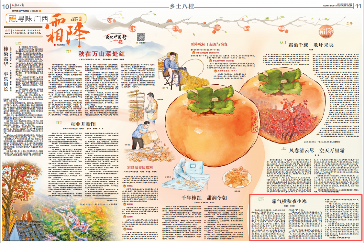 霜降。圖源:大作網 當北方大地漸次銀霜鋪地,地處華南的八桂大地正迎來一年中最為舒爽的時期。 此時夏季風撤離、水汽減少,帶有夏季特征的暴雨、高溫、臺風等災害性天氣陸續退出天氣舞臺,而帶有冬季特征的寒潮、雨雪等尚未全面登場,天氣相對平穩。雖然有時候冷空氣南下遇上暖濕氣流,也會制造“一場秋雨一場寒”的蕭瑟景致,但總體上來說,空氣干燥,云量稀少,天高云淡的晴爽天氣居多。據常年10月下旬氣候數據統計,桂北平均氣溫16℃—18.7℃、沿海三市22.3℃左右,其余地區介于20℃—22℃之間,空氣相對濕度維持在50%—80%,與人體體感最舒適的天氣標準非常契合。白天晴空朗朗時氣溫升至28℃左右, 夜幕降臨后因云層稀少、熱量散失快,氣溫下降, 晝夜溫差可達十幾攝氏度。不過,此時的氣溫還低不到能見“霜”的程度。 氣象上,把每年秋季首次發生的霜凍稱為“初霜凍”。當夜間氣溫降至0℃以下,空氣中的水汽會在冰冷的地面和草木物體表面凝華形成白色冰晶, 這就是霜。霜降節氣到來之際,我國東北、西北大部以及青藏高原等地通常已經入冬,初霜凍早已報到;真正在霜降節氣期間迎來初霜凍的區域,主要集中在黃河中下游一帶。廣西除了局地高寒山區10月中旬可見初霜,其余大部地區得等到12月至1月上旬。 古詩有云“月落烏啼霜滿天”,似乎霜像雨一樣是從天而降,其實并非如此,它和“露”的形成機理一樣,都是“由地而發”,是地面的水汽遇冷凝結而成。在有霜的早晨你若細細觀察,就會看到晶瑩的霜花在草葉的正面背面、上方下方都有出現。廣西霜降難見霜,正是因大部地區近地表溫度遠在0℃以上,僅能形成液態露珠。 “停車坐愛楓林晚,霜葉紅于二月花”,霜降時節秋景正盛。溫度降低、日照變短,樹葉不再制造新的葉綠素,占主導地位的綠色逐漸褪去,其他色素主導的顏色就顯露出來。胡蘿卜素和葉黃素占上風,葉片便披上黃金甲;花青素上位,葉子就會由綠轉紅。霜色愈濃,秋色愈絢爛。然而這場盛大的秋景通常不會持續太久,隨著氣溫下降和水分減少,葉子會逐漸枯萎脫落。“黃葉舞秋風”的凄美浪漫,其實是樹木減少水分蒸騰、儲存養分安穩過冬的“斷尾求生”。 都說霜打的果蔬分外甜,是因為晝夜溫差增大,植物白天光合作用制造的糖分多,晚上消耗少,能積累下更多糖分。氣溫降低還觸發植物啟動自救方案,把體內的淀粉分解成可溶性的葡萄糖和果糖,這些“防凍甜水”降低了細胞液的冰點,使細胞不容易被凍壞,算是植物越冬生存策略被人類味蕾感知的意外收獲。