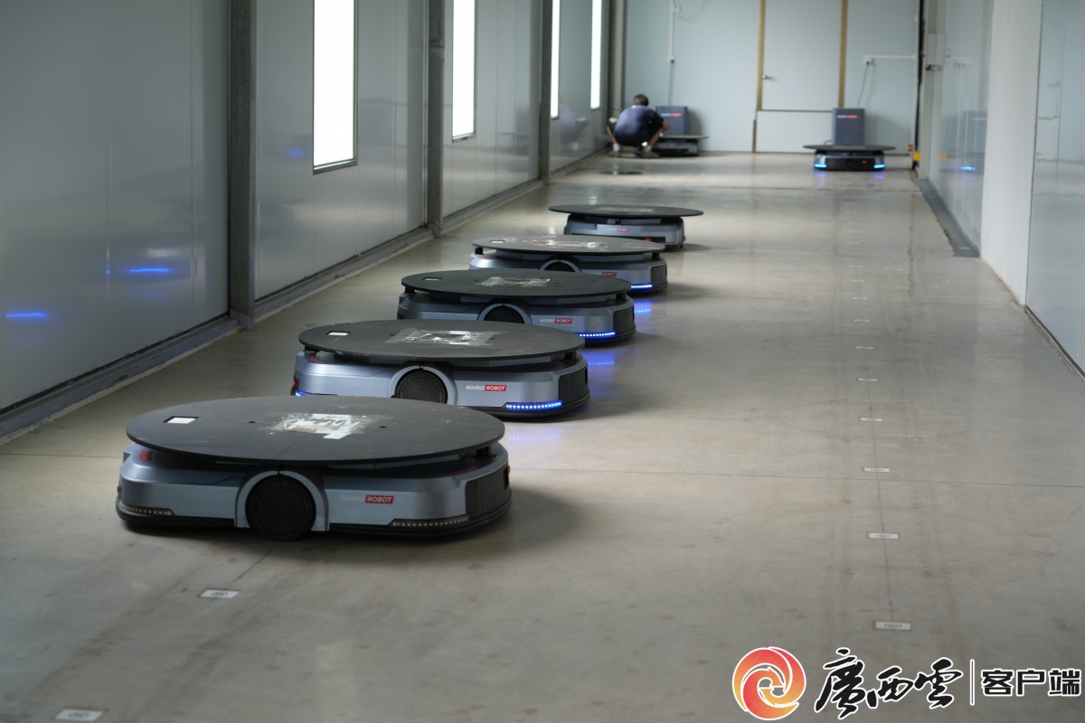 平樂供電局服務人員上門服務柿農,柿農分享豐收喜悅。吳濤 攝 晨光中,柿餅交易的喧囂漸漸平息,而各地的加工生產線卻奏響了新的奮進樂章。廣西柿界食品科技有限公司的生產基地里,AI智能系統如交響樂的總指揮,引領著圓柿從入籃、掃描、清洗到碼放、運輸、烘烤的全過程。 柿餅智能運輸機器。楊靈燁 攝 “我們用AI技術模擬晝夜高溫差的自然環境,數字算法下,溫度、時間掐著點,糖分凝得剛剛好。”該公司總經理韋韜指著智能化烤房介紹。全流程智能體系的高效運轉,讓柿子鮮果變身冰柿、柿片等暢銷產品。 如果說,技術創新是平樂柿子產業“智造”的“硬骨架”,產品研發與標準構建則是滋養產業活力的“軟實力”。 2015年,桂林國農生態農業科技有限公司董事長徐紹宣,在漫山柿林間錨定產業方向,創立“樂柿”品牌。他帶領團隊歷經8年攻堅,2023年首個68%黃金水糖比的“冰柿”橫空出世,2024年“樂柿黃金柿”再續傳奇,產值超600萬元。