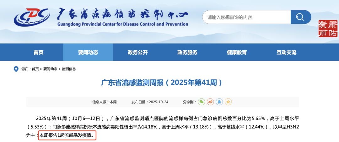 10月24日,廣東省疾控中心發布廣東省流感監測周報2025年第41周(10月6日~12日),全省報告1起流感暴發疫情,發生在學校,已采取有效控制措施。