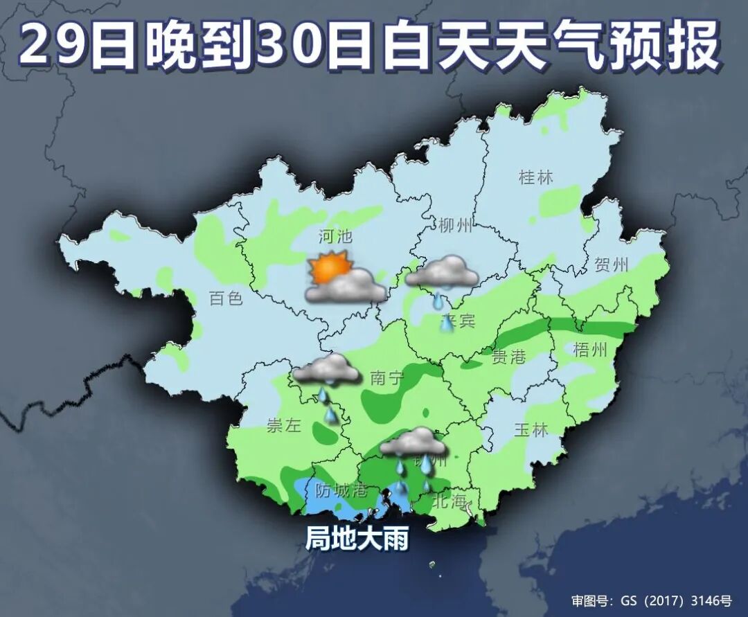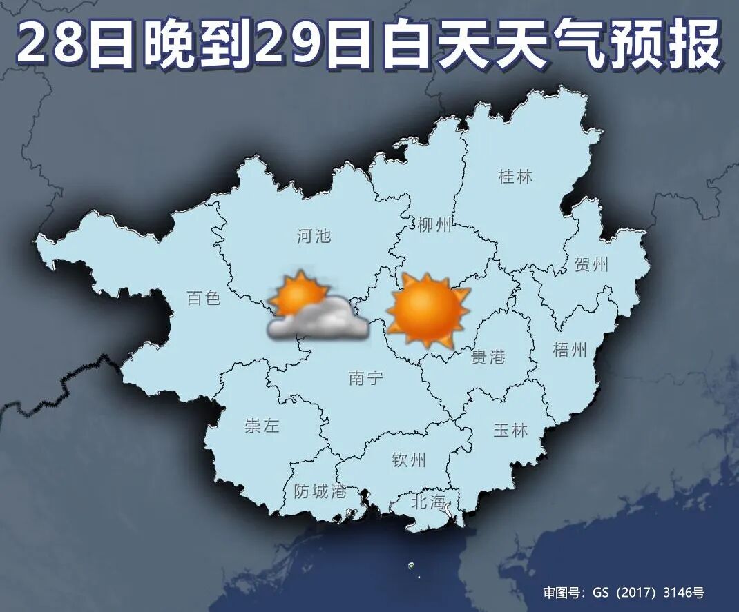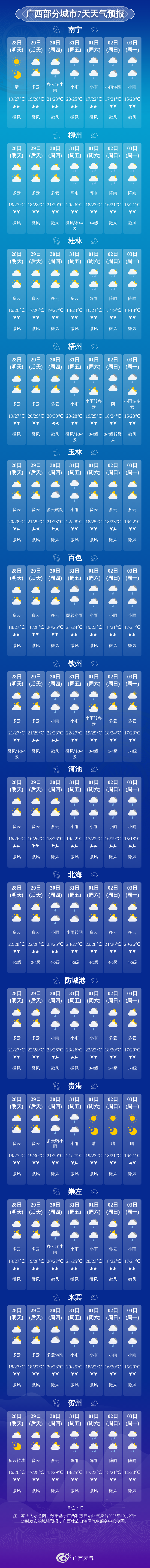 未來三天天氣預報 廣西氣象臺27日17時發布預報: 陸地天氣預報 今天晚上到明天白天,全區多云,其中百色市局地有小雨。各地氣溫:桂北15~27℃,桂南18~28℃。 森林火險氣象等級:全區4級,高火險。 南寧市:今天晚上到明天白天,晴天,東北風2級,最低氣溫19℃,最高氣溫27℃。 28日晚上到29日白天,全區多云到晴。各地氣溫:桂北15~28℃,桂南18~29℃。 29日晚上到30日白天,桂南部分地區有小到中雨、局地大雨,桂北多云有陣雨。各地氣溫:桂北16~28℃,桂南19~30℃。 海洋天氣預報 北部灣海面:今天晚上到明天白天,多云到晴,偏北風5級,陣風6~7級;28日晚上到29日白天,多云有陣雨,偏北風4~5級、陣風6~7級;29日晚上到30日白天,小到中雨、局地大雨,偏東風4~5級、陣風6~7級。請海上船只注意。