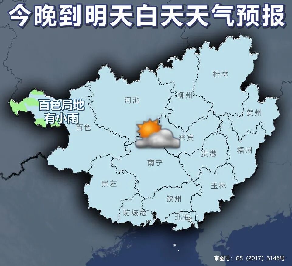 今天晚上到明天白天 除了百色市局地將有些小雨外 全區大部維持多云天氣