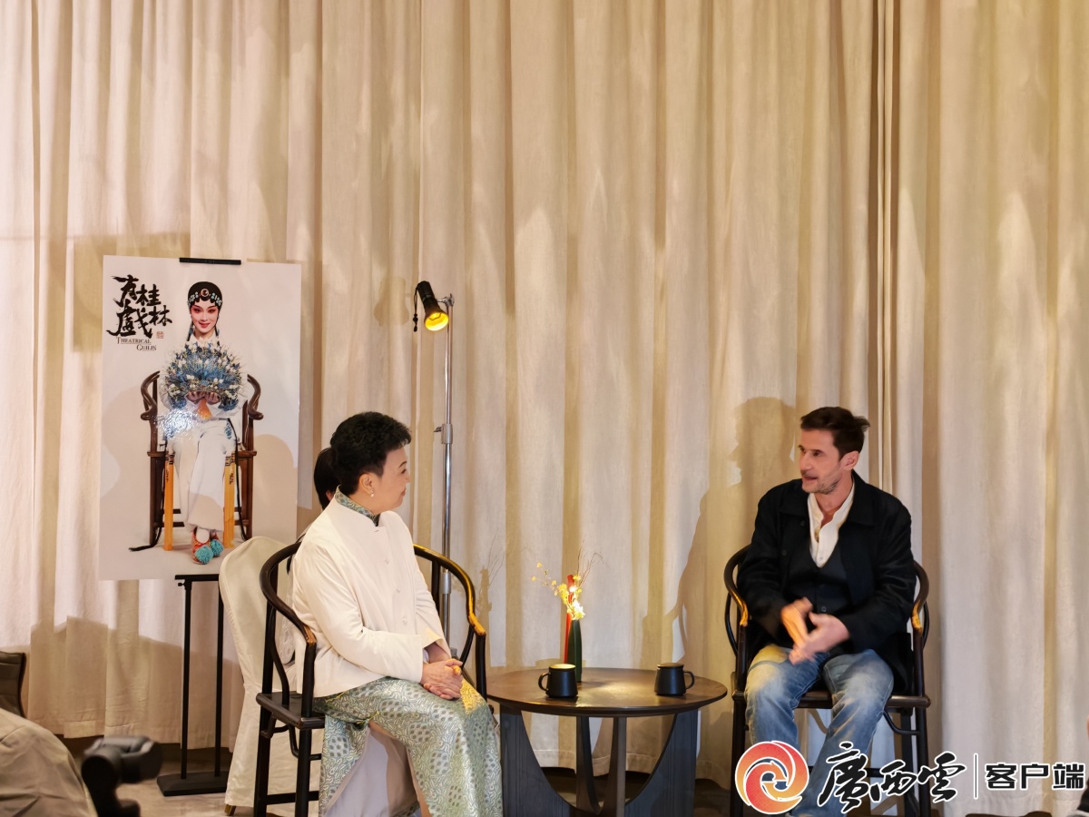 中外戲劇人對話。 他稱贊:“桂劇演員用極簡的舞臺手段傳遞豐富情感,這種‘留白’的藝術非常高級,未來希望能將桂劇的程式化動作融入歐洲當代戲劇創作,為跨文化劇場注入新靈感。”張樹萍認為:“非遺藝術需要融合發展,需要借助年輕化、國際化的交流方式,才能讓歷史悠久的桂劇聲腔持續流淌在當代生活中。” 活動現場還特別設置了彩調模仿、文場學唱、漁鼓節奏教學等互動環節。來自德國的諾伯特說:“十分榮幸能夠參與這樣的活動,特別喜歡演員們優美的唱腔、精致的服裝。”古典主義肖像攝影師佩雷表示,地方戲曲是向國際社會展示中國文化的重要組成部分,愿這種國際交流越辦越好。 “俏見桂韻·桂劇文化展”策展人蘇寧表示,本次活動以“山水+戲劇”為理念,通過觸摸戲服、即興學唱等形式,讓桂劇從舞臺走向生活,成為連接東西方美學的紐帶。