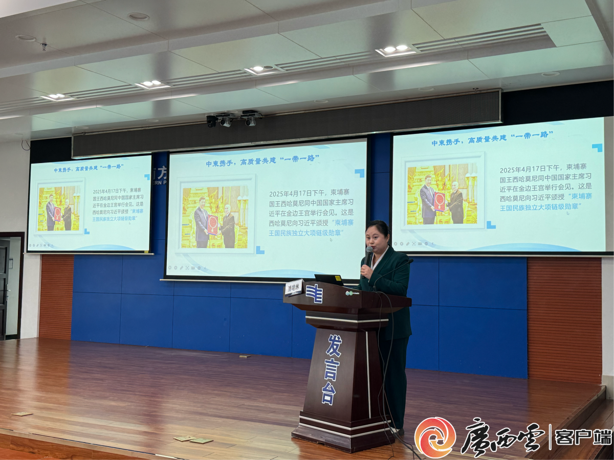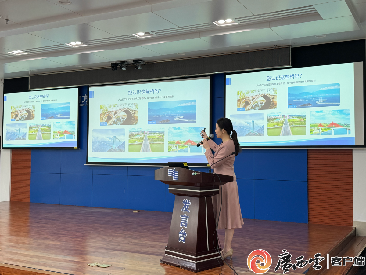 講師宣講風采。 全國優秀共青團干部、來賓市第七中學教師潘靖琳分享了援教柬埔寨期間,傳播中華文化的經歷,用真心換來當地學生“我的老師從中國來”的真摯告白;廣西民族大學學生、退役軍人徐禮強從守衛首都的執勤經歷出發,闡述了對國家安全與青年責任的深刻理解;來自基礎交通建設行業的“00后”青年鄧佳麗以《“橋”見未來》為題,展現了年輕一代在重大工程建設中的智慧與汗水。