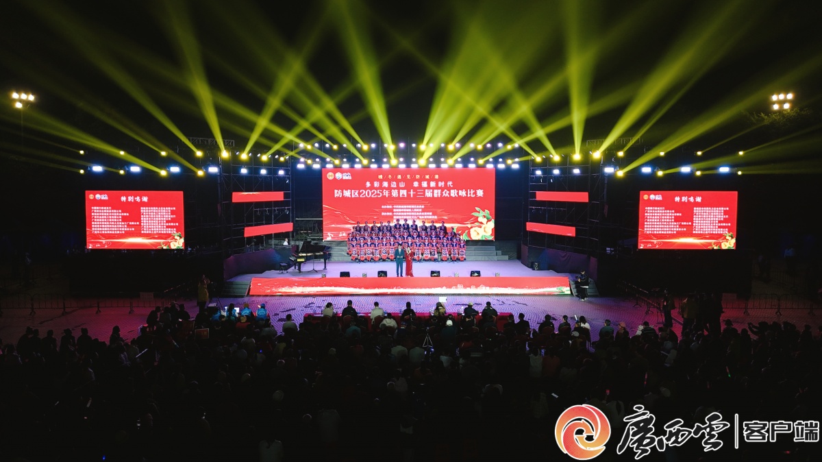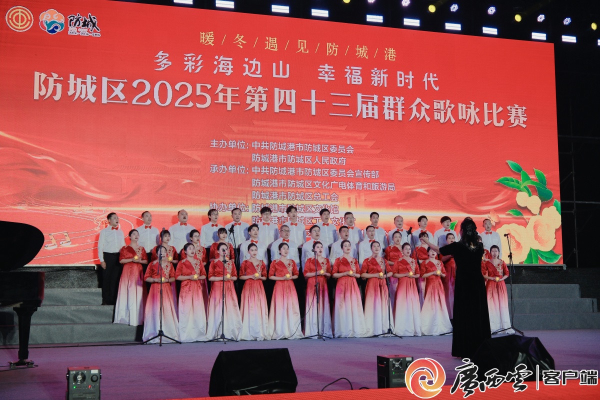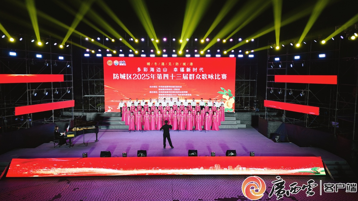 “多彩海邊山 幸福新時代”防城區2025年第四十三屆群眾歌詠比賽現場。記者 楊康 攝 本屆歌詠比賽分為鄉鎮(街道)組和區直(駐區)組兩組分批進行,比賽首日聚焦鄉鎮組別,來自全區各鎮、街道的13支參賽隊伍齊聚一堂,用昂揚的歌聲展現新時代防城風貌,現場氣氛熱烈,高潮迭起。