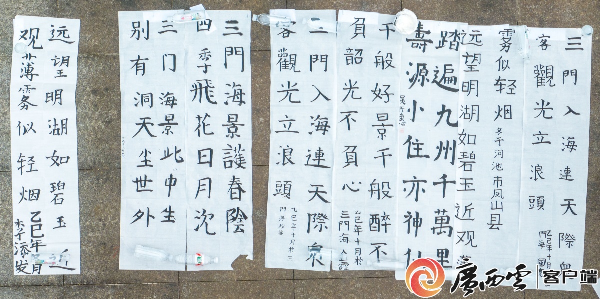 留學生們的書寫作品展示。羅邦福 攝 來自巴基斯坦的右江民族醫學院留學生法贊則選擇了行書創作,他筆下的“翰墨傳情,山水為證”筆勢舒展、韻味十足。 “這是我第一次來鳳山,也是第一次在這么美的地方寫書法!”法贊興奮地說,比賽前組委會組織大家乘船游覽了三門海,清澈的河水、奇特的溶洞讓他流連忘返!白┬性谌芏蠢,就像走進了童話世界,非常好玩、非常漂亮。通過書寫漢字,我不僅學會了新的詞匯,更感受到了中國文化的博大精深。” 據了解,本次大賽還設置了作品評審、優秀作品展示、書法文化體驗等多個環節。評審團由廣西書法院專家組成,從筆法、結構、章法、意境等多個維度對參賽作品進行打分,最終評選出一、二、三等獎及特等獎若干。獲獎作品將在鳳山三門海景區、主辦單位官網及海外社交媒體平臺同步展示,進一步擴大中華書法文化的國際影響力。
