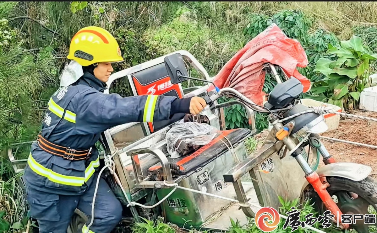 消防指戰員救援現場。 12月11日,防城港市消防救援支隊江山消防救援站在開展訓練途中,突遇群眾求助,一輛三輪車不慎跌入路邊深坑。消防指戰員迅速組織開展救援,成功將三輪車拉回路面。