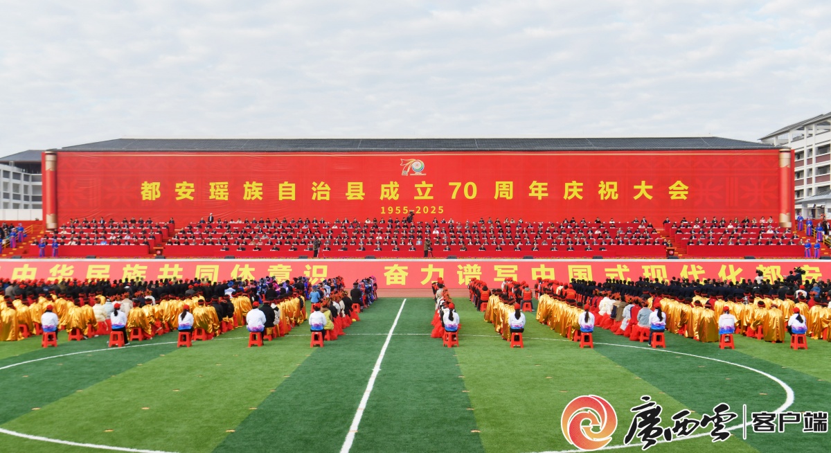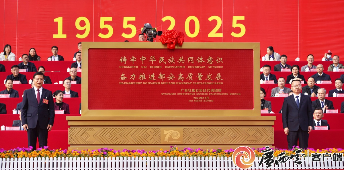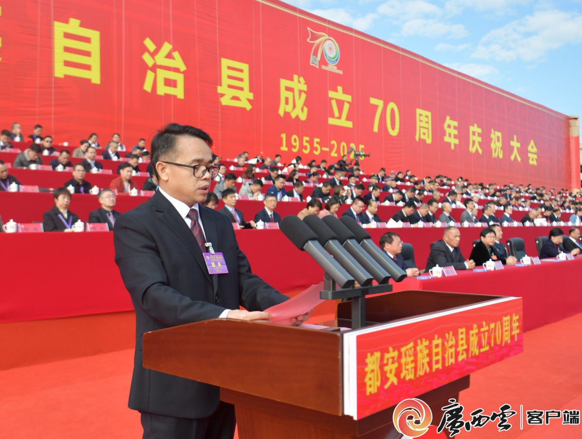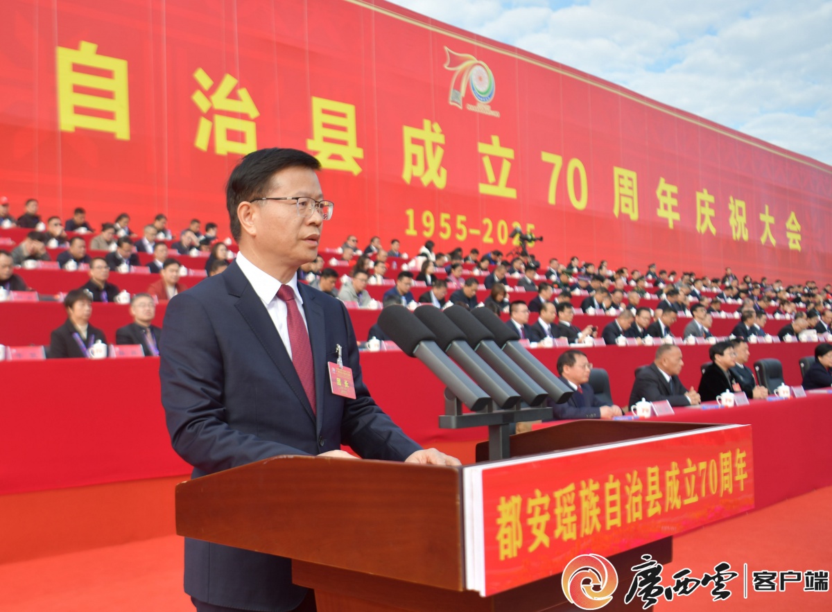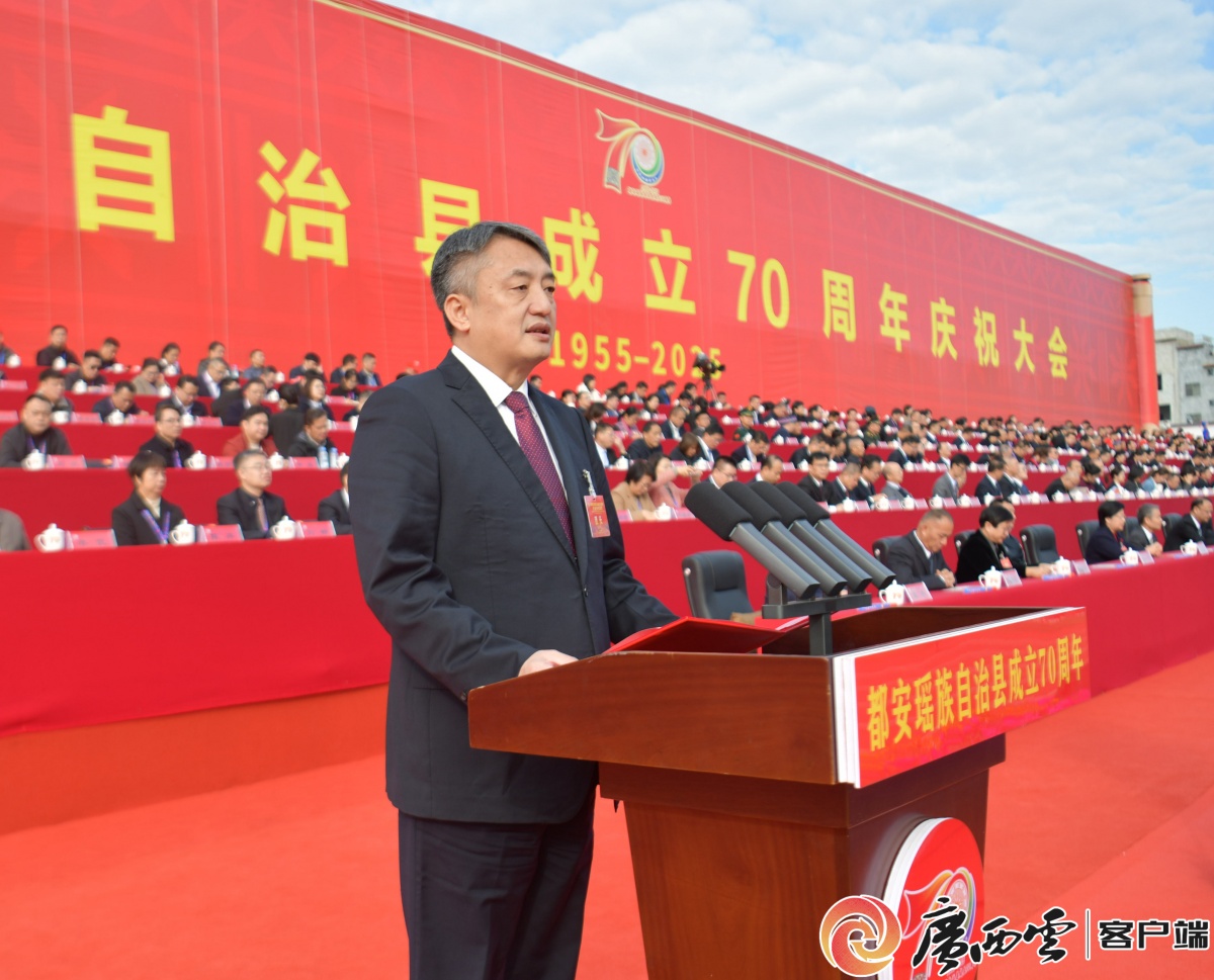 都安瑤族自治縣成立70周年慶祝大會(huì)現(xiàn)場(chǎng)。 七秩盛典,萬眾歡騰。12月15日上午,都安瑤族自治縣成立70周年慶祝大會(huì)舉行,各族兒女身著盛裝齊聚一堂,用歌聲謳歌新時(shí)代的幸福生活,以舞姿抒發(fā)對(duì)家園的深情眷戀,共同見證石山王國變?yōu)橐司右藰I(yè)新城的歷史性變遷。 都安瑤族自治縣成立70周年慶祝大會(huì)現(xiàn)場(chǎng)。 全國人大民委、國家民委祝賀團(tuán)團(tuán)長(zhǎng),國家民委教育司副司長(zhǎng)王學(xué)榮;自治區(qū)代表團(tuán)團(tuán)長(zhǎng),自治區(qū)黨委常委、統(tǒng)戰(zhàn)部部長(zhǎng)譚丕創(chuàng);自治區(qū)代表團(tuán)副團(tuán)長(zhǎng),自治區(qū)人大常委會(huì)副主任劉有明、自治區(qū)副主席藍(lán)曉、自治區(qū)政協(xié)副主席黃俊華、廣西軍區(qū)少將副司令員楊猛;市代表團(tuán)團(tuán)長(zhǎng),市委書記秦春成,市委副書記、市長(zhǎng)王軍;市代表團(tuán)副團(tuán)長(zhǎng),市政協(xié)主席黎麗等出席相關(guān)活動(dòng),與都安各族干部群眾共同歡慶盛會(huì)。 代表團(tuán)成員步入會(huì)場(chǎng)。 上午9時(shí),慶祝大會(huì)開始。全場(chǎng)起立,奏唱國歌,五星紅旗冉冉升起。 大會(huì)舉行升國旗儀式。 王學(xué)榮對(duì)都安瑤族自治縣70年來取得的成就給予肯定和祝賀。王學(xué)榮指出,都安70年發(fā)展成就充分證明,只有在中國共產(chǎn)黨領(lǐng)導(dǎo)下,堅(jiān)持中國特色解決民族問題的正確道路、堅(jiān)持民族區(qū)域自治制度、堅(jiān)持鑄牢中華民族共同體意識(shí)、堅(jiān)持全面深化改革開放,才能建設(shè)都安更加美好的明天,才能滿足各族人民對(duì)美好生活的向往。站在新的歷史起點(diǎn)上,希望都安認(rèn)真學(xué)習(xí)貫徹習(xí)近平總書記關(guān)于加強(qiáng)和改進(jìn)民族工作的重要思想,堅(jiān)持將鑄牢中華民族共同體意識(shí)作為各項(xiàng)工作的主線,為以中國式現(xiàn)代化全面推進(jìn)強(qiáng)國建設(shè)、民族復(fù)興偉業(yè)而不懈奮斗。 國家民委教育司副司長(zhǎng),全國人大民委、國家民委祝賀團(tuán)團(tuán)長(zhǎng)王學(xué)榮講話。 受自治區(qū)黨委書記、自治區(qū)人大常委會(huì)主任陳剛,自治區(qū)主席韋韜的委托,譚丕創(chuàng)代表自治區(qū)黨委、自治區(qū)人大常委會(huì)、自治區(qū)人民政府、自治區(qū)政協(xié)、廣西軍區(qū)和全區(qū)各族人民,向都安各族群眾表示祝賀。譚丕創(chuàng)指出,70年來特別是新時(shí)代以來,都安各族干部群眾接續(xù)奮斗、砥礪前行,經(jīng)濟(jì)實(shí)力穩(wěn)步提升,鄉(xiāng)村面貌煥然一新,綠色發(fā)展成效顯著,人民生活蒸蒸日上,民族團(tuán)結(jié)持續(xù)鞏固,取得了輝煌成就。在“十四五”迎來收官、“十五五”即將開局的特殊節(jié)點(diǎn),都安要堅(jiān)持和加強(qiáng)黨的全面領(lǐng)導(dǎo),確保都安各項(xiàng)工作始終沿著正確方向前進(jìn)。要完整準(zhǔn)確全面貫徹新發(fā)展理念,加快推動(dòng)都安經(jīng)濟(jì)社會(huì)高質(zhì)量發(fā)展。要踐行以人民為中心的發(fā)展思想,努力讓都安各族人民過上更加幸福美好的生活。要堅(jiān)持鑄牢中華民族共同體意識(shí)工作主線,鞏固發(fā)展民族團(tuán)結(jié)進(jìn)步良好局面。 自治區(qū)黨委常委、統(tǒng)戰(zhàn)部部長(zhǎng),自治區(qū)代表團(tuán)團(tuán)長(zhǎng)譚丕創(chuàng)講話。 受市代表團(tuán)團(tuán)長(zhǎng)、市委書記秦春成的委托,王軍代表市委、市人大常委會(huì)、市人民政府、市政協(xié)、河池軍分區(qū)和全市各族人民,向都安各族干部群眾表示祝賀,向關(guān)心、支持和幫助都安建設(shè)與發(fā)展的社會(huì)各界表示衷心感謝。王軍說,70年來,特別是黨的十八大以來,都安各族干部群眾以“雄心征服千層嶺,壯志壓倒萬重山”的無畏氣魄,成功闖出了大石山區(qū)鄉(xiāng)村振興發(fā)展新路子,開創(chuàng)了經(jīng)濟(jì)社會(huì)蓬勃發(fā)展、民族團(tuán)結(jié)碩果累累、社會(huì)事業(yè)全面進(jìn)步的嶄新局面,邁上了高質(zhì)量發(fā)展、現(xiàn)代化建設(shè)的新征程。希望都安各族干部群眾更加緊密地團(tuán)結(jié)在黨中央周圍,全力以赴推動(dòng)經(jīng)濟(jì)社會(huì)各項(xiàng)事業(yè)邁上新臺(tái)階,共同描繪民族復(fù)興的壯美藍(lán)圖,在建設(shè)“六新河池”的生動(dòng)實(shí)踐中展現(xiàn)新?lián)?dāng)、實(shí)現(xiàn)新突破。 河池市委副書記、市長(zhǎng),河池市代表團(tuán)團(tuán)長(zhǎng)王軍致辭。 慶祝大會(huì)上,全國人大民委、國家民委祝賀團(tuán)成員吐送江艾山宣讀了全國人大民委、國家民委賀電;藍(lán)曉宣讀了自治區(qū)賀電;黎麗宣讀了河池市賀電。自治區(qū)代表團(tuán)向都安贈(zèng)送了賀匾,河池市代表團(tuán)向都安贈(zèng)送了賀禮。