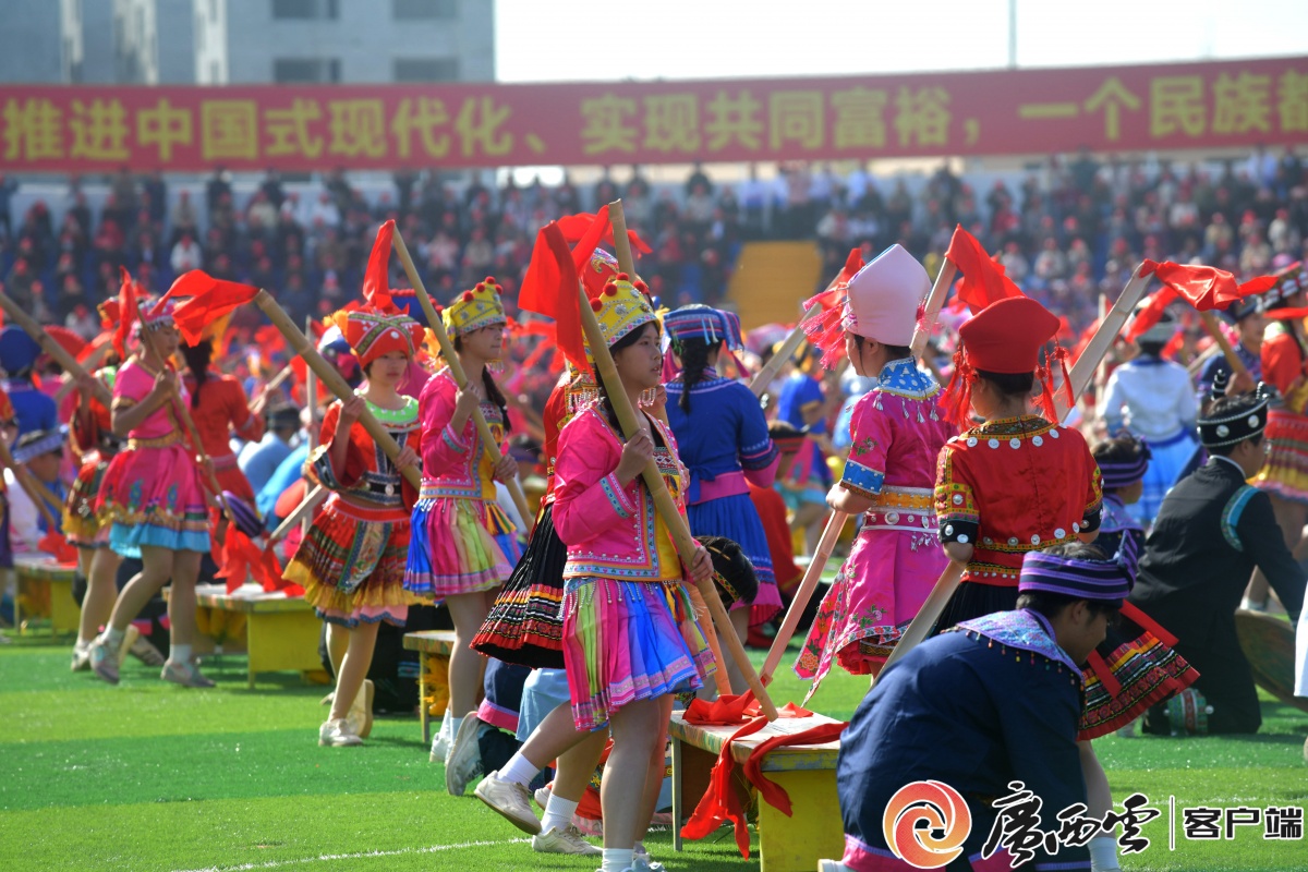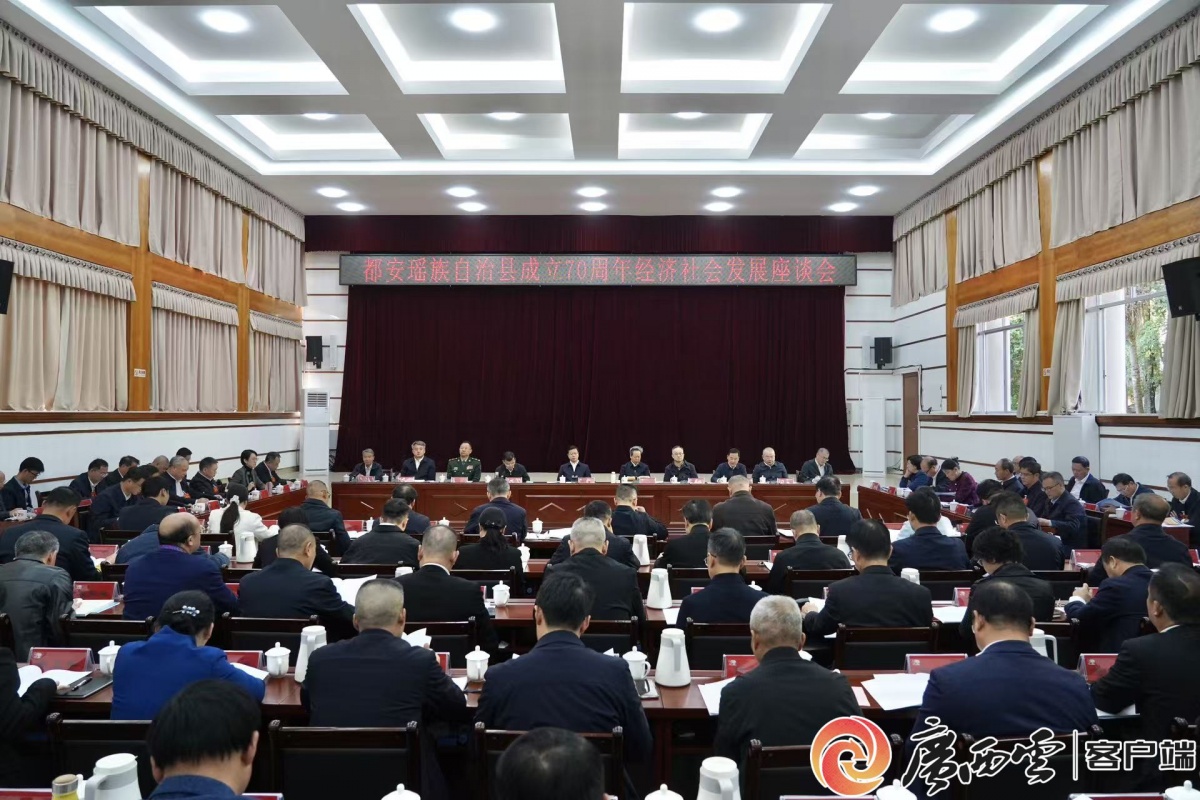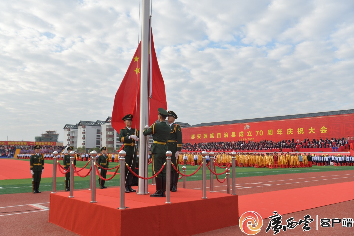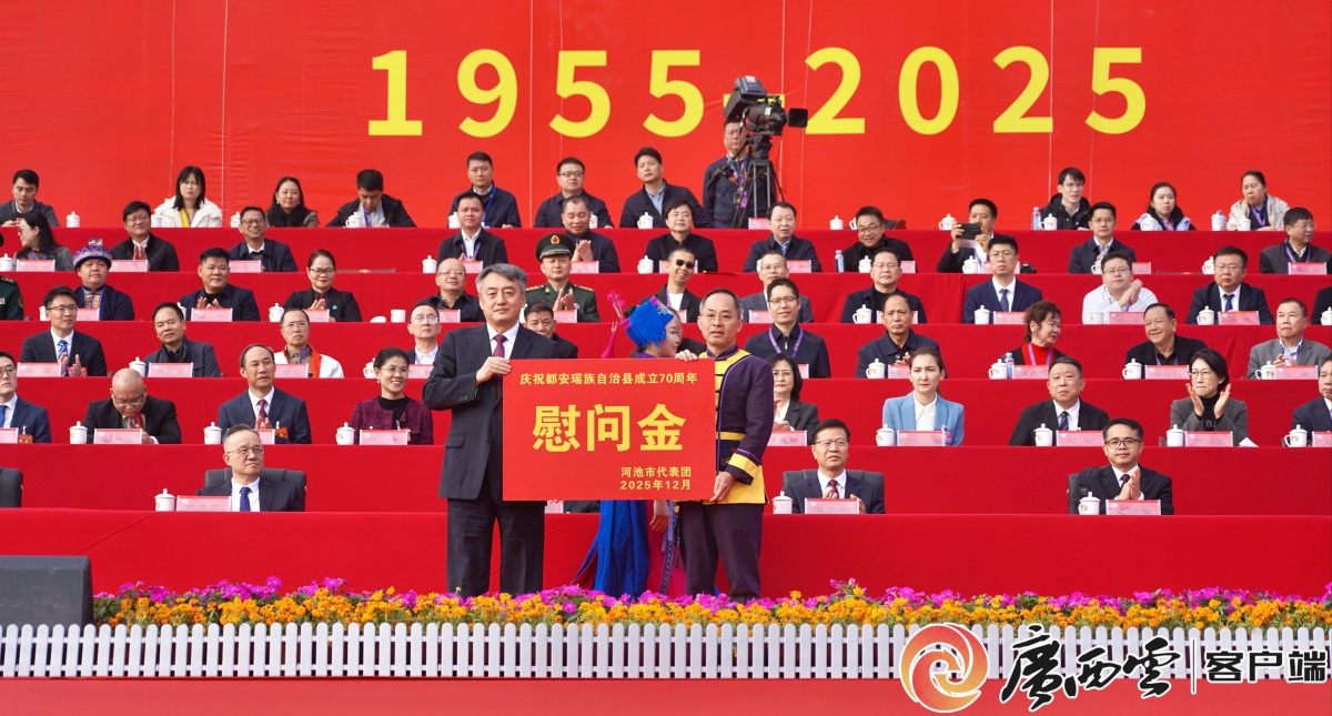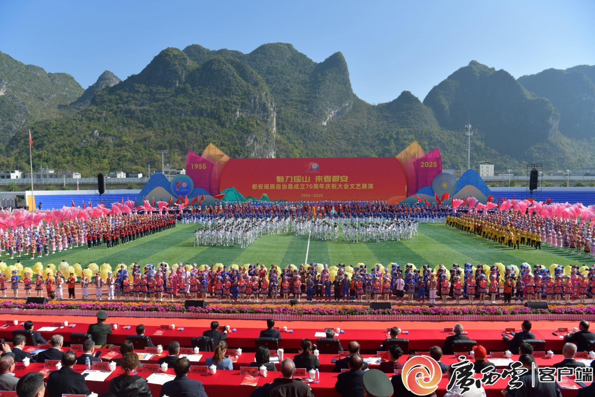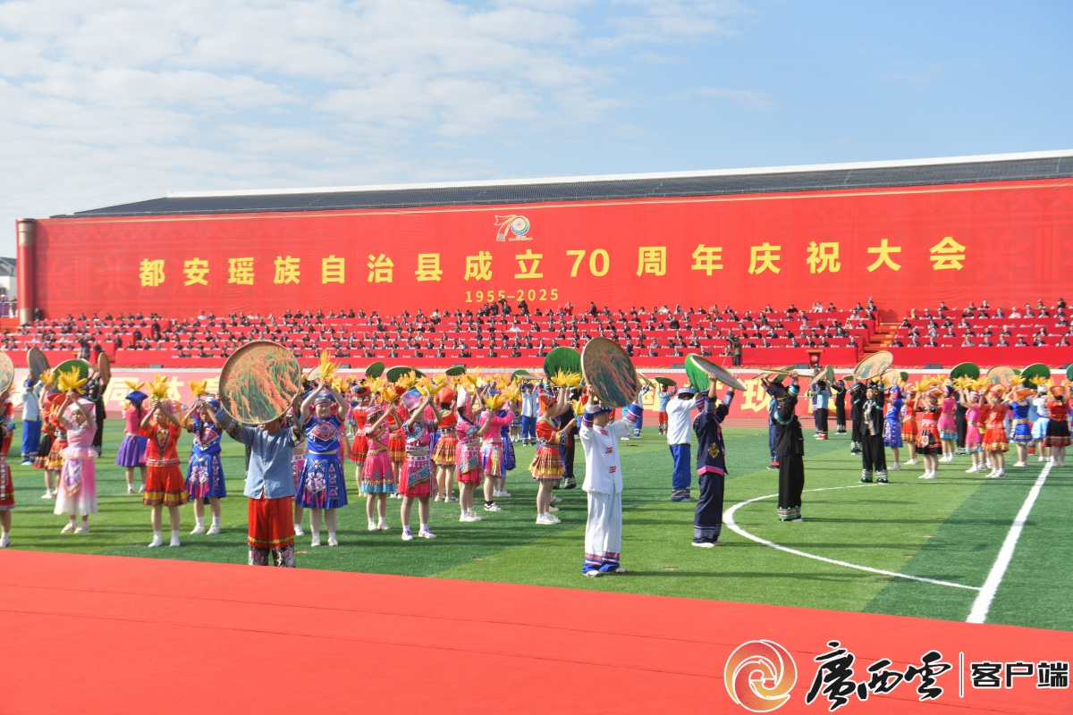 都安瑤族自治縣成立70周年慶祝大會(huì)現(xiàn)場(chǎng)。 七秩盛典,萬眾歡騰。12月15日上午,都安瑤族自治縣成立70周年慶祝大會(huì)舉行,各族兒女身著盛裝齊聚一堂,用歌聲謳歌新時(shí)代的幸福生活,以舞姿抒發(fā)對(duì)家園的深情眷戀,共同見證石山王國變?yōu)橐司右藰I(yè)新城的歷史性變遷。 都安瑤族自治縣成立70周年慶祝大會(huì)現(xiàn)場(chǎng)。 全國人大民委、國家民委祝賀團(tuán)團(tuán)長(zhǎng),國家民委教育司副司長(zhǎng)王學(xué)榮;自治區(qū)代表團(tuán)團(tuán)長(zhǎng),自治區(qū)黨委常委、統(tǒng)戰(zhàn)部部長(zhǎng)譚丕創(chuàng);自治區(qū)代表團(tuán)副團(tuán)長(zhǎng),自治區(qū)人大常委會(huì)副主任劉有明、自治區(qū)副主席藍(lán)曉、自治區(qū)政協(xié)副主席黃俊華、廣西軍區(qū)少將副司令員楊猛;市代表團(tuán)團(tuán)長(zhǎng),市委書記秦春成,市委副書記、市長(zhǎng)王軍;市代表團(tuán)副團(tuán)長(zhǎng),市政協(xié)主席黎麗等出席相關(guān)活動(dòng),與都安各族干部群眾共同歡慶盛會(huì)。 代表團(tuán)成員步入會(huì)場(chǎng)。 上午9時(shí),慶祝大會(huì)開始。全場(chǎng)起立,奏唱國歌,五星紅旗冉冉升起。 大會(huì)舉行升國旗儀式。 王學(xué)榮對(duì)都安瑤族自治縣70年來取得的成就給予肯定和祝賀。王學(xué)榮指出,都安70年發(fā)展成就充分證明,只有在中國共產(chǎn)黨領(lǐng)導(dǎo)下,堅(jiān)持中國特色解決民族問題的正確道路、堅(jiān)持民族區(qū)域自治制度、堅(jiān)持鑄牢中華民族共同體意識(shí)、堅(jiān)持全面深化改革開放,才能建設(shè)都安更加美好的明天,才能滿足各族人民對(duì)美好生活的向往。站在新的歷史起點(diǎn)上,希望都安認(rèn)真學(xué)習(xí)貫徹習(xí)近平總書記關(guān)于加強(qiáng)和改進(jìn)民族工作的重要思想,堅(jiān)持將鑄牢中華民族共同體意識(shí)作為各項(xiàng)工作的主線,為以中國式現(xiàn)代化全面推進(jìn)強(qiáng)國建設(shè)、民族復(fù)興偉業(yè)而不懈奮斗。 國家民委教育司副司長(zhǎng),全國人大民委、國家民委祝賀團(tuán)團(tuán)長(zhǎng)王學(xué)榮講話。 受自治區(qū)黨委書記、自治區(qū)人大常委會(huì)主任陳剛,自治區(qū)主席韋韜的委托,譚丕創(chuàng)代表自治區(qū)黨委、自治區(qū)人大常委會(huì)、自治區(qū)人民政府、自治區(qū)政協(xié)、廣西軍區(qū)和全區(qū)各族人民,向都安各族群眾表示祝賀。譚丕創(chuàng)指出,70年來特別是新時(shí)代以來,都安各族干部群眾接續(xù)奮斗、砥礪前行,經(jīng)濟(jì)實(shí)力穩(wěn)步提升,鄉(xiāng)村面貌煥然一新,綠色發(fā)展成效顯著,人民生活蒸蒸日上,民族團(tuán)結(jié)持續(xù)鞏固,取得了輝煌成就。在“十四五”迎來收官、“十五五”即將開局的特殊節(jié)點(diǎn),都安要堅(jiān)持和加強(qiáng)黨的全面領(lǐng)導(dǎo),確保都安各項(xiàng)工作始終沿著正確方向前進(jìn)。要完整準(zhǔn)確全面貫徹新發(fā)展理念,加快推動(dòng)都安經(jīng)濟(jì)社會(huì)高質(zhì)量發(fā)展。要踐行以人民為中心的發(fā)展思想,努力讓都安各族人民過上更加幸福美好的生活。要堅(jiān)持鑄牢中華民族共同體意識(shí)工作主線,鞏固發(fā)展民族團(tuán)結(jié)進(jìn)步良好局面。 自治區(qū)黨委常委、統(tǒng)戰(zhàn)部部長(zhǎng),自治區(qū)代表團(tuán)團(tuán)長(zhǎng)譚丕創(chuàng)講話。 受市代表團(tuán)團(tuán)長(zhǎng)、市委書記秦春成的委托,王軍代表市委、市人大常委會(huì)、市人民政府、市政協(xié)、河池軍分區(qū)和全市各族人民,向都安各族干部群眾表示祝賀,向關(guān)心、支持和幫助都安建設(shè)與發(fā)展的社會(huì)各界表示衷心感謝。王軍說,70年來,特別是黨的十八大以來,都安各族干部群眾以“雄心征服千層嶺,壯志壓倒萬重山”的無畏氣魄,成功闖出了大石山區(qū)鄉(xiāng)村振興發(fā)展新路子,開創(chuàng)了經(jīng)濟(jì)社會(huì)蓬勃發(fā)展、民族團(tuán)結(jié)碩果累累、社會(huì)事業(yè)全面進(jìn)步的嶄新局面,邁上了高質(zhì)量發(fā)展、現(xiàn)代化建設(shè)的新征程。希望都安各族干部群眾更加緊密地團(tuán)結(jié)在黨中央周圍,全力以赴推動(dòng)經(jīng)濟(jì)社會(huì)各項(xiàng)事業(yè)邁上新臺(tái)階,共同描繪民族復(fù)興的壯美藍(lán)圖,在建設(shè)“六新河池”的生動(dòng)實(shí)踐中展現(xiàn)新?lián)?dāng)、實(shí)現(xiàn)新突破。 河池市委副書記、市長(zhǎng),河池市代表團(tuán)團(tuán)長(zhǎng)王軍致辭。 慶祝大會(huì)上,全國人大民委、國家民委祝賀團(tuán)成員吐送江艾山宣讀了全國人大民委、國家民委賀電;藍(lán)曉宣讀了自治區(qū)賀電;黎麗宣讀了河池市賀電。自治區(qū)代表團(tuán)向都安贈(zèng)送了賀匾,河池市代表團(tuán)向都安贈(zèng)送了賀禮。