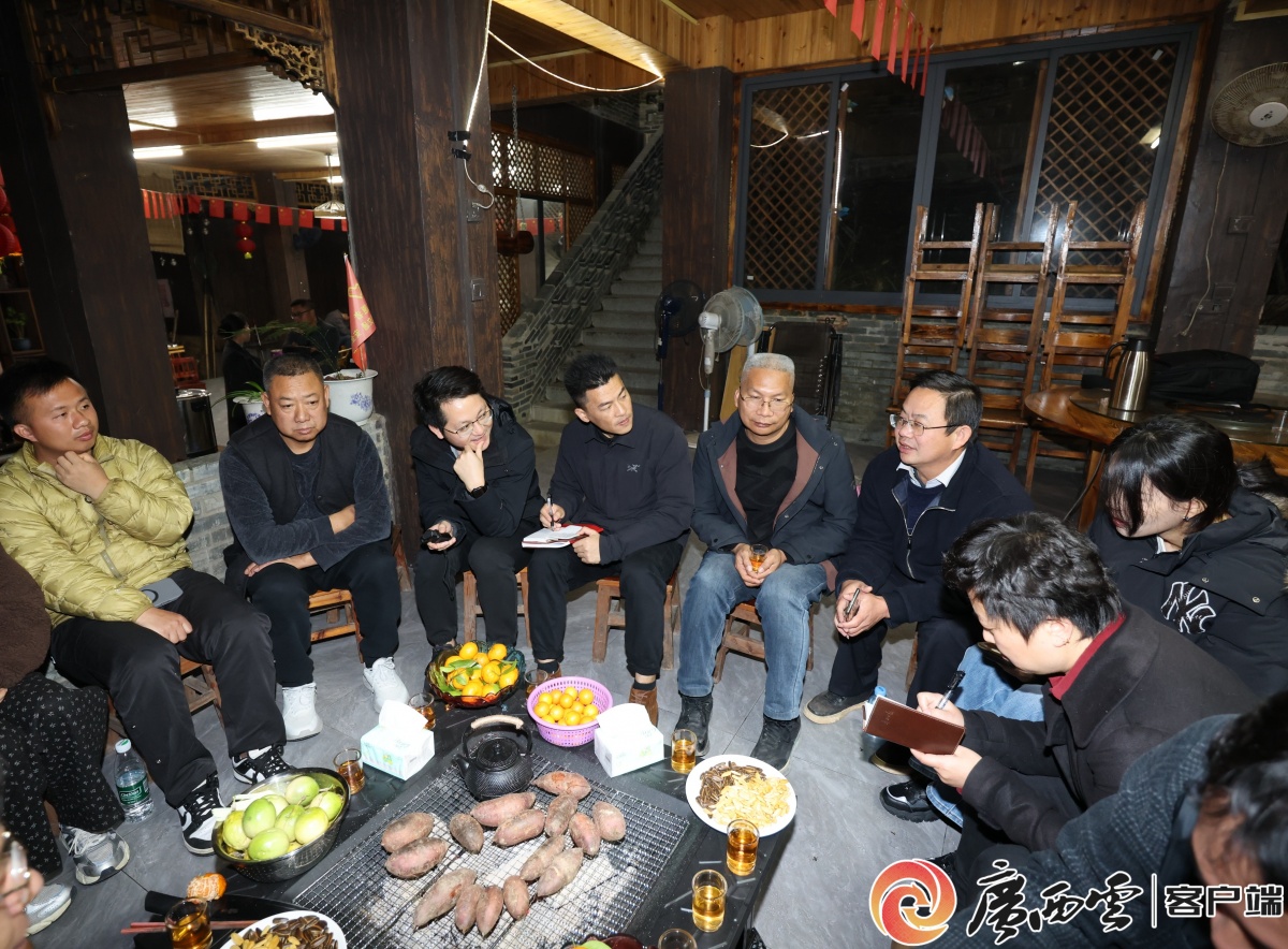 廣西云-廣西日報記者夜訪興安華江瑤族鄉老山界腳下的龍塘寨,與當地干部群眾話發展。廣西云-廣西日報記者 徐天保 攝 12月17日晚,一些村民相約在寨內的龍泉山莊。 火塘燒得正旺,炭火星子不時噼啪一聲。 “今年生意還可以,從早忙到晚。”村民龍家興先開口。 有人接話:“肯定是沖你家‘瘦身魚’來的吧。魚湯泡飯,鼎鍋刮爛!” “那是啵!”龍家興用筷子戳了戳面前正烤著的紅薯,發現沒熟,就把紅薯翻了個面,繼續烤,“大魚買回來,在山泉活水里養幾個月,也不喂料。魚是瘦了,但味道好,價格反而上去了!”