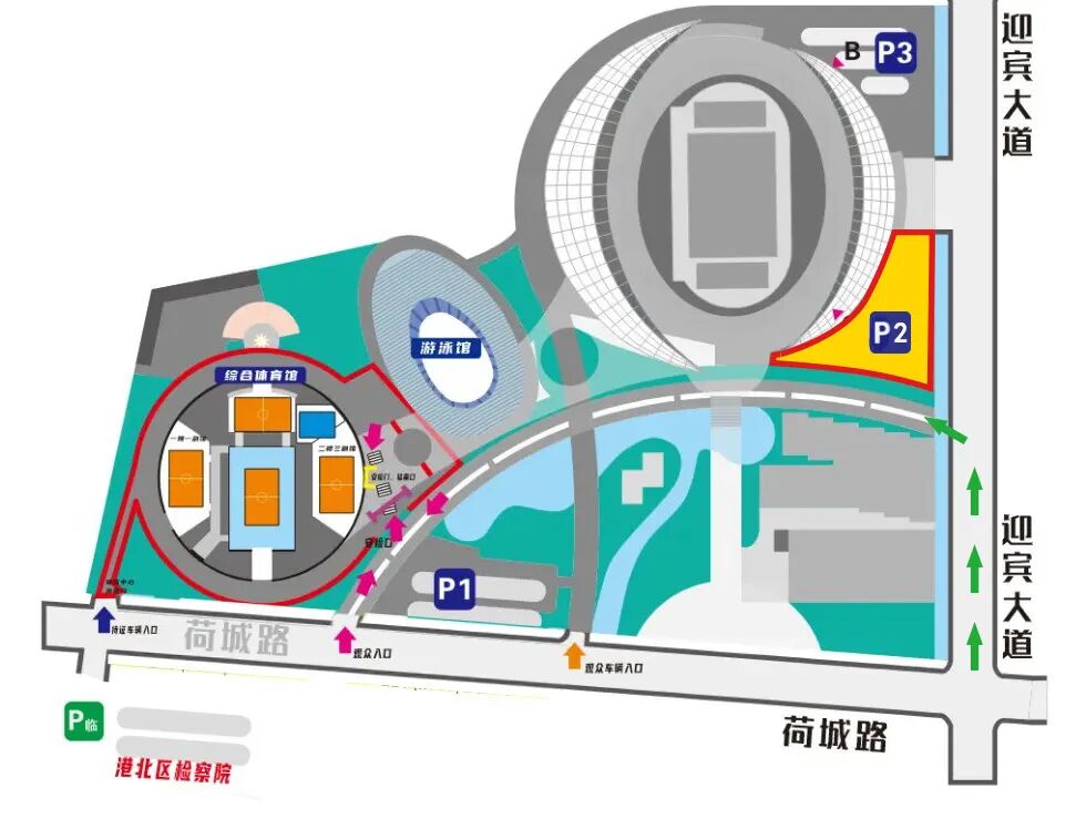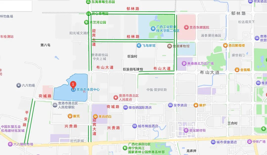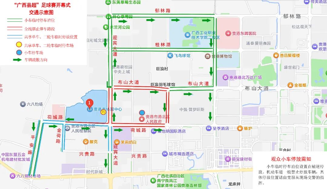 (1)郁林路(仙衣路口—迎賓大道路口) 停車位置:雙向非機動車道或者輔道靠邊停車,散場時車輛指定往中山北路方向疏導。 (2)迎賓大道(郁林路口—布山大道路口) 停車位置:雙向非機動車道或者輔道靠邊停車,散場時車輛指定往桂林路或郁林路方向疏導。 (3)桂林路(仙衣路口—迎賓大道路口) 停車位置:雙向非機動車道或者輔道靠邊停車,散場時車輛指定往中山路方向疏導。 (4)仙衣路(布山大道路口—桂林路口) (5)仙衣路延長線(桂林路口—郁林路口) (6)平安路(金港大道路口—荷城路口) 停車位置:雙向非機動車道或者輔道靠邊停車,散場時車輛指定往金港大道方向疏導。 (7)迎賓大道(金港大道路口—興貴路口) 停車位置:雙向非機動車道或者輔道靠邊停車。 共享車輛、二輪車臨時停放點