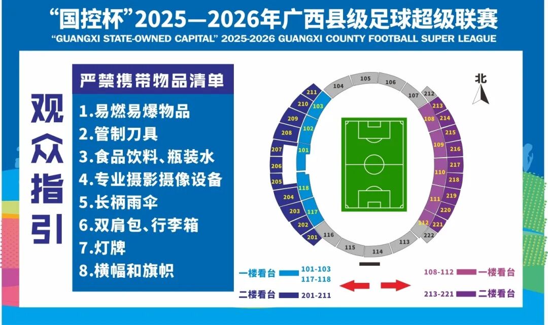 12月20日19:00 “國控杯”2025—2026年廣西縣級足球超級聯賽 開幕式暨揭幕戰 將在貴港市體育中心主體育場熱血開賽 為讓大家順利入場、安心觀賽 這份超全入場指南請一定收好 提前準備,快樂加倍 特別提醒 體育中心內部停車場 只允許持有車輛通行證的工作車輛進入 體育中心內部停車場不對觀眾小車開放 建議大家合理安排出行交通工具