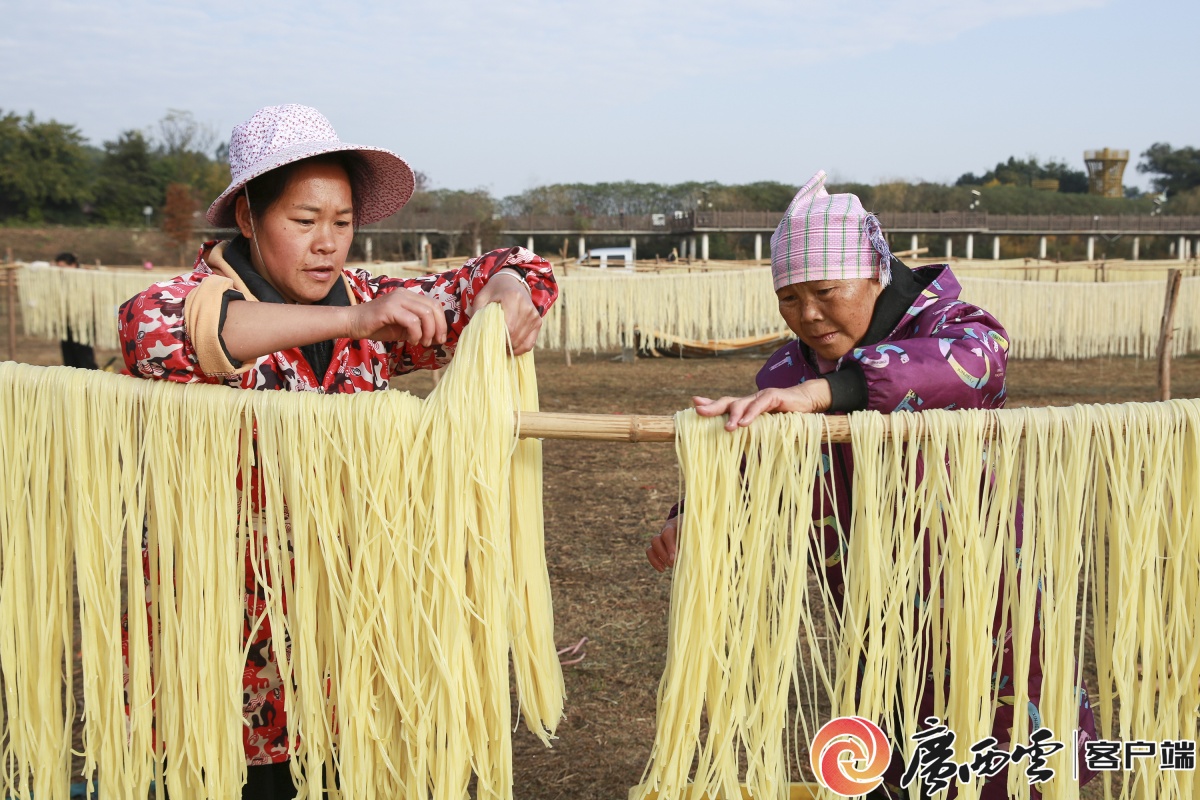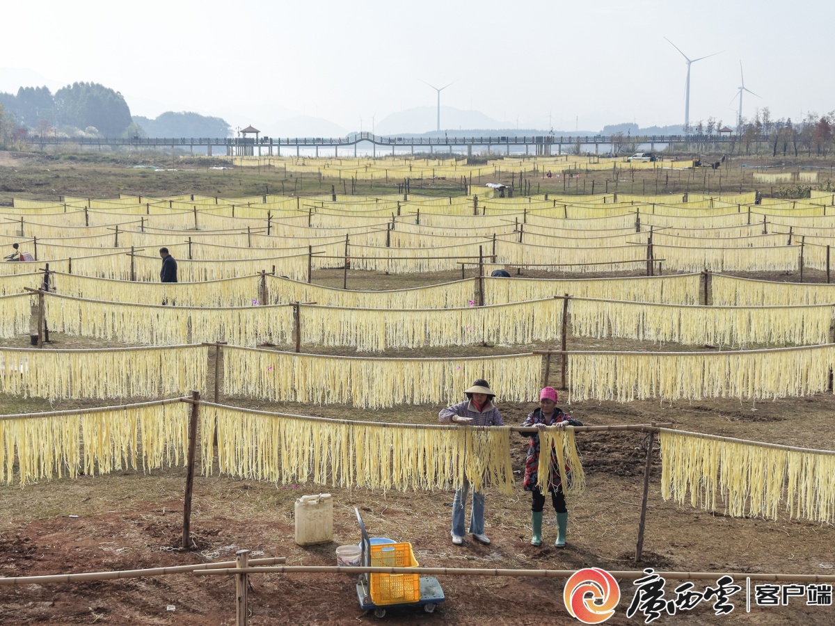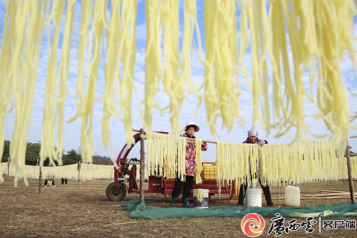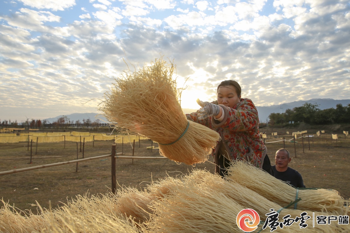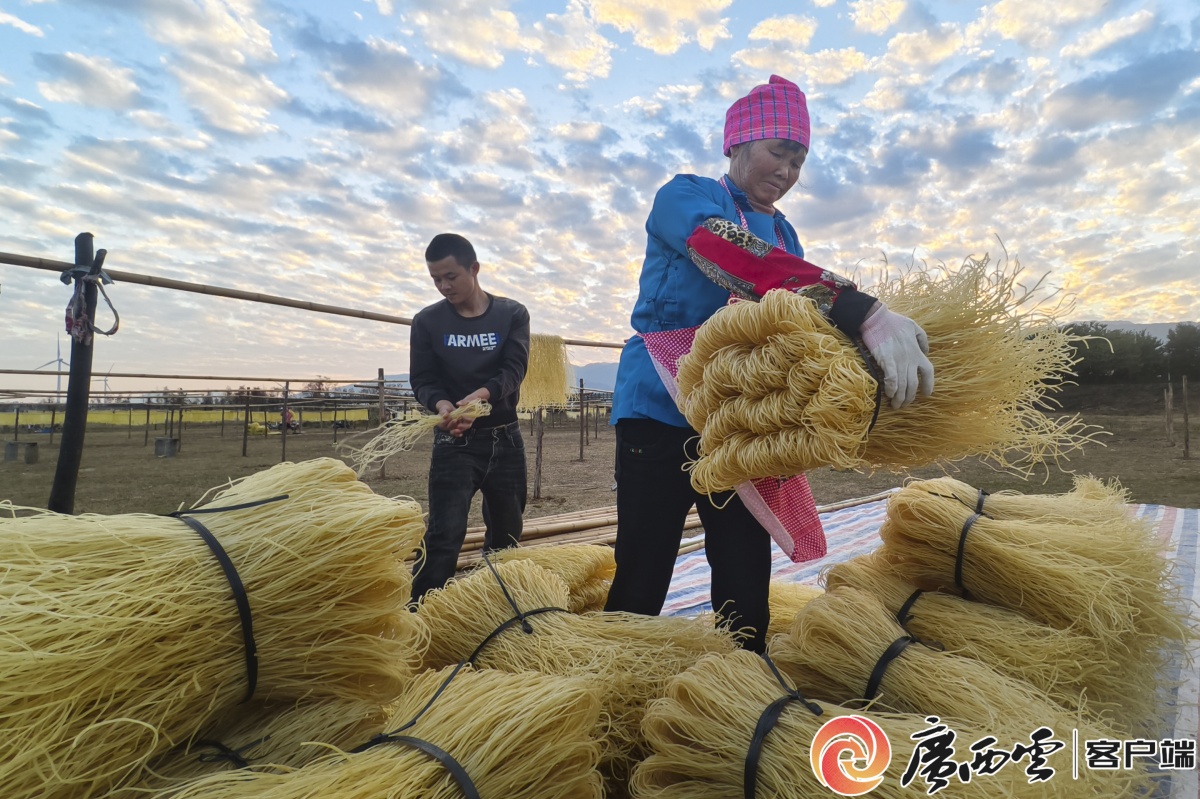 冬至將至,賀州市富川瑤族自治縣富陽鎮虎頭村暖意融融,處處洋溢著豐收的喜悅。家家戶戶的院落、曬場上,金絲般的手工粉條整齊懸掛,在冬日暖陽下泛著誘人光澤,村民們正忙著攪拌、濾漿、下粉、撈粉、掛桿……趕制這批節前“搶手貨”,讓老手藝跑出增收“加速度”。