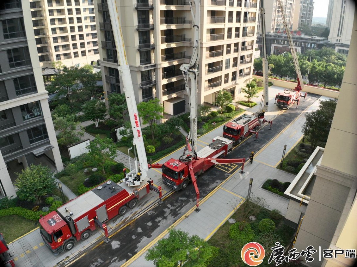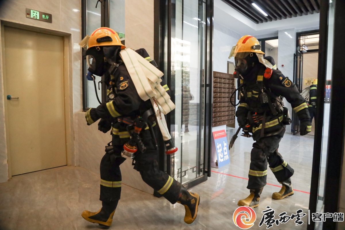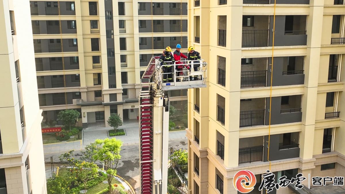 進行水泵接合器供水測試。 此次活動緊扣高層建筑火災救援特點,先在5棟高層建筑開展專項裝備效能測試。參演力量聚焦供水保障、火場排煙、應急通信、舉高作業、人體外骨骼輔助、無人機運用等6項核心作戰課題,通過實地測試與現場教學,精準采集各類裝備實戰數據,為各地明確“適配裝備清單”“最優作戰編組”提供科學依據,推動裝備優勢向實戰效能轉化。 內攻搜救演練。 裝備測試結束后,跨區域滅火救援實戰演練隨即展開。演練模擬欽州市某高層住宅小區突發火災,火勢快速蔓延,多名群眾被困。欽州市消防救援支隊立即啟動應急預案,調集7個消防救援站及戰勤保障力量趕赴現場,同時向廣西消防救援總隊申請跨區域增援。很快,欽州、北海、防城港3市消防救援支隊的34輛消防車、160名消防救援人員迅速集結,與欽州市公安、應急、醫療、供水、供電、通信等部門協同作戰,形成救援合力。 利用云梯轉移“被困人員”。
