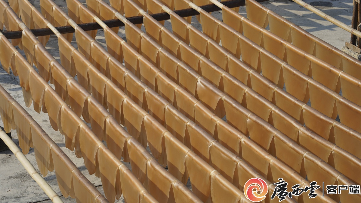 在陽光下晾曬的粉皮。覃義琛 攝 深冬晴好,羅城仫佬族自治縣黃金鎮(zhèn)義和村江口屯的空氣里,彌漫著一股獨(dú)特的甜香與煙火氣。這里迎來了一年中最忙碌的時節(jié)——手工紅薯粉的“黃金制作期”。 12月18日,江口屯內(nèi)家家戶戶庭院內(nèi)爐火正旺,蒸汽繚繞,一張張晶瑩剔透的粉皮在暖陽下閃爍如琥珀,講述著匠心與豐收的故事。