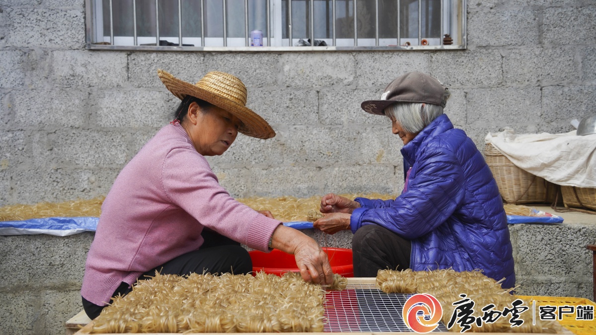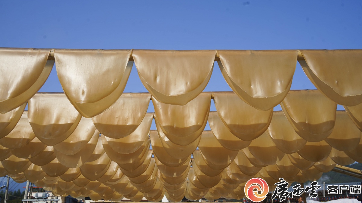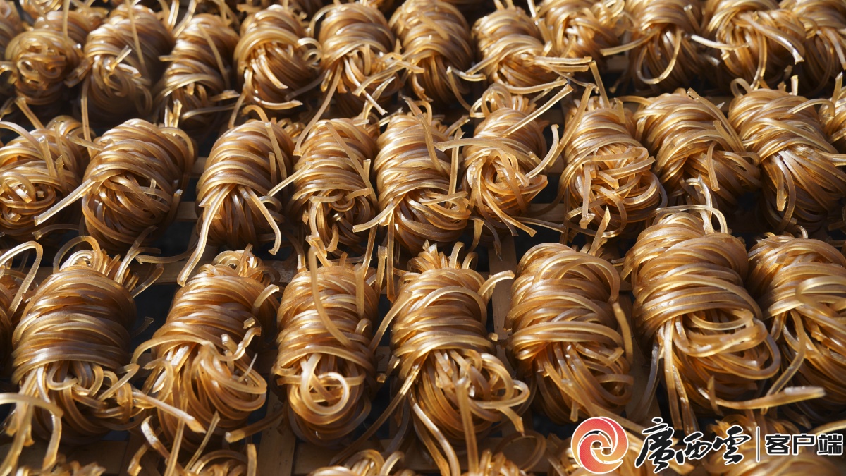 村民正在綁粉。覃義琛 攝 村民潘廣云站在一口大鍋前,手腕輕轉(zhuǎn),將乳白色的紅薯淀粉漿舀入石鍋。“一個石鍋只放一碗漿,手要快,鋪得平,不然粉皮易破。”她邊說邊操作,不過兩三分鐘,漿液便凝結(jié)成透亮柔韌的粉皮。鍋蓋掀起,熱氣撲面,粉皮被迅速卷起,掛上竹架,在冬日陽光下漸漸染上金黃。 這門手藝,潘廣云做了四十多年。在江口屯,像她這樣的老師傅不少。蒸粉、揭皮、晾曬……一系列動作早已成為肌肉記憶。一入冬,整個村子便沉浸在重復(fù)卻充滿儀式感的勞作中,用最質(zhì)樸的方式,守護(hù)著祖輩傳下的味道。