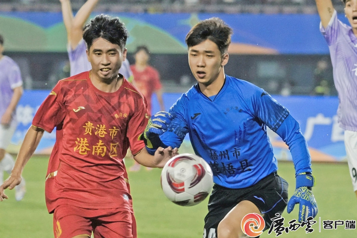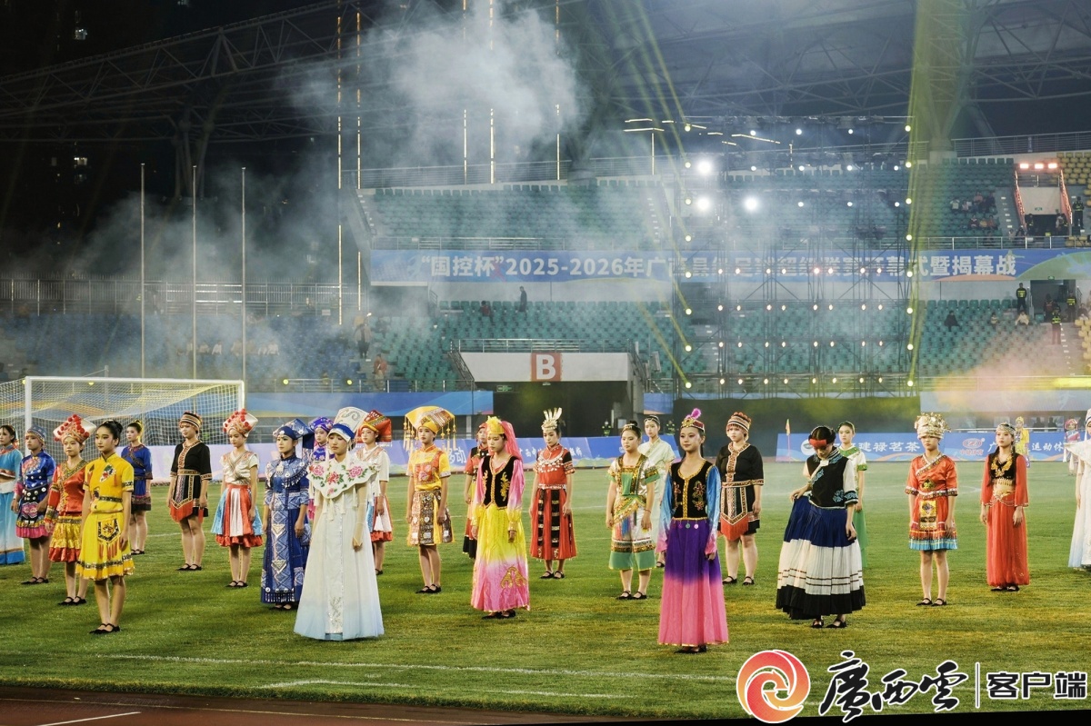 民族色彩濃厚的開幕式暖場表演。(本文圖片均為賽事組委會提供) 綠茵逐夢,“縣”在出發。當晚19時的貴港市體育中心體育場,《廣西尼的呀》等廣西民歌旋律在夜空中響起,28支參賽隊伍的隊旗進入開幕式會場。觀眾坐滿看臺,營造出熱鬧氛圍。 揭幕戰由貴港市港南區足球隊對陣梧州市蒼梧縣足球隊。在主場球迷制造的熱辣聲浪中,雙方奉獻了一場高水平較量。港南區足球隊一開場就擺出搶攻的陣型,并創造了多次有威脅的進攻機會。不過,90分鐘戰罷,雙方都沒有取得進球。 根據賽制,對陣雙方90分鐘內分出勝負,勝隊獲得3分,負隊積0分,若戰平則直接進入點球決勝,勝隊獲得2分。最終,憑借守門員的神勇發揮,主場作戰的港南隊4∶3勝出。