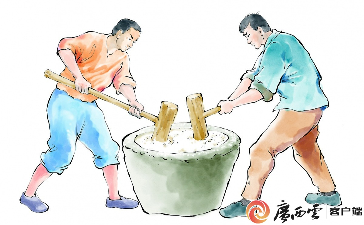 打糍粑。王兀 繪圖 冬至是中華民族重要的傳統(tǒng)節(jié)氣,在廣西這片多民族聚居地,各地冬至慶祝方式既有共性,又因地域差異呈現(xiàn)鮮明特色。從桂北到桂南,從山區(qū)到沿海,多樣的地理環(huán)境與民族文化,勾勒出多彩的冬至民俗畫卷。 桂北桂林、柳州一帶,素來流傳“冬至大如年”的說法,冬至被視作重要節(jié)日。家家戶戶備好豐盛團圓飯,臘肉、臘腸、糯米酒是餐桌標配。當?shù)匕傩樟晳T冬至制作臘味,此時北風盛行、氣候干冷,制成的臘味風味最佳,易保存至春節(jié)。部分瑤、苗族村寨會集體“打糍粑”,熱氣騰騰的糍粑蘸上炒好的芝麻花生粉,寓意團圓美滿。此外,桂北保留莊重的冬至祭祖?zhèn)鹘y(tǒng),午后家族成員常攜雞、肉、糍粑、酒水前往祖墳或宗祠祭祀,既緬懷先人,也維系家族血脈情感與認同。 桂南南寧、北海、欽州一帶,冬至習俗溫情平和,同樣重視家庭團聚,飲食卻更重時令特色。白切雞、檸檬鴨、清蒸魚是宴席主角,搭配應季鮮蔬凸顯食材本味;沿海地區(qū)則常以海鮮為主角,蘊含“年年有余”之意。部分地區(qū)有吃湯圓的習俗,紅糖姜水中翻滾的湯圓既能驅寒暖胃,又象征“團團圓圓”。與桂北不同,桂南少見大規(guī)模祭祀,多為家庭小范圍祭拜。一些壯族村落會制作五色糯米飯,用天然植物染料將糯米染成五色,成品色澤美觀、口感軟糯,承載五谷豐登的祈愿。