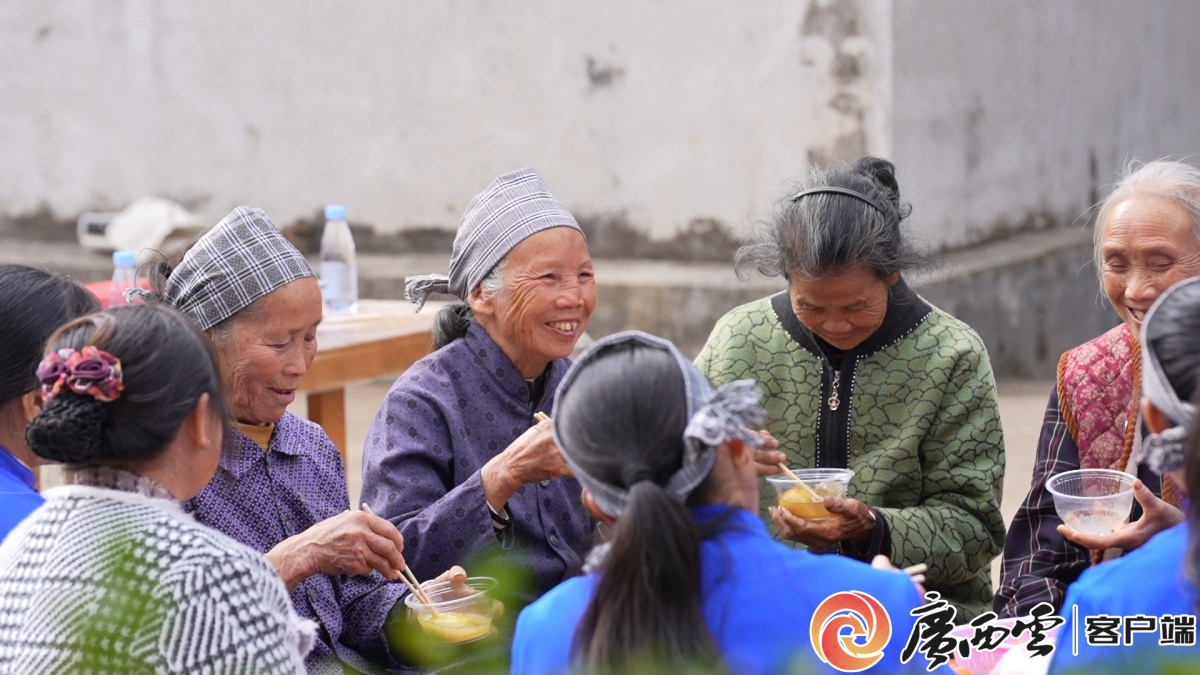 村民們一起吃團子粑粑。胡見微 李景妍 攝 煮熟的團子粑 常配著一碗熱騰騰的姜糖水一起享用 軟糯的團子浸在甜暖的姜湯里 一口咬下,軟糯彈牙 暖意從口中直達心底