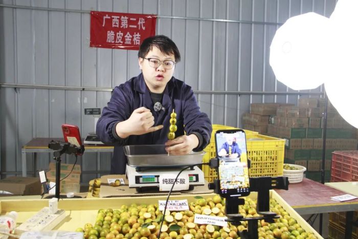 12月15日晚,桂林臨桂區五通鎮一倉庫直播間內燈火通明。主播“小胖”的背后堆滿果箱,墻上貼著產品名。屏幕上訂單不斷滾動,銷往全國各地。在這里,類似的直播間已悄然興起7個,共32人參與。今年8月以來,這些村播團隊通過直播助力當地銷售百香果、香芋、紅薯等農產品,銷售額已突破500萬元。 在一個傳統農業鄉鎮,直播電商如何從無到有、生根發芽?它又是如何重塑這里的人力結構、產業形態的?近日,記者走進五通鎮,跟隨多個村播團隊的足跡,試圖解析這個“從零到一”的鄉鎮樣本。 人·蛻變 從“不敢說話”到“獨立控場” “剛開始,他們連話都不敢大聲說。”回憶起村民初次接觸直播的場景,五通鎮副鎮長于善英記憶猶新。 今年8月,五通鎮黨委、鎮政府聯合本土的福遠三農電商基地,開辦了首期村播培訓班,從23個村中選拔出30多名有意愿、敢嘗試的年輕人、“寶媽”和返鄉青年參與培訓。培訓內容非常“接地氣”:從如何持握手機、設計開場白,到如何展示產品、克服鏡頭恐懼。 為了幫學員們卸下心理包袱,于善英自己上陣示范。鎮黨委、鎮政府還組織學員到陽朔電商基地、桂林瓦窯市場實地觀摩。 在當地,最早摸索直播電商之路的,是軍營村青年、福遠三農電商基地負責人李瑜升。李瑜升的團隊原本在書畫直播領域年銷售額已超4000萬元,在取得成功后,他毅然返鄉開辟三農電商新賽道。在培訓中,李瑜升不斷傳遞“抱團取暖”的理念,吸引了越來越多村民加入。 “小胖”唐曾雄就是其中之一。眼見鄉鄰們種出的優質農產品賣不上價,利潤多被外地收購商賺走,他心里很不是滋味。“為什么不能自己賣?”抱著這個樸素的念頭,他與妻子、朋友共同組建了“小胖村播團隊”,勤學苦練,如今已能獨立完成長達4小時的直播。