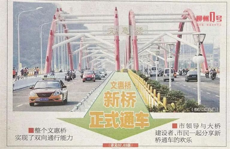 《柳州晚報》2013年8月22日刊登的文惠橋新橋正式通車的圖文報道。 新橋與老橋并行,宛如兩道跨江“彩虹”,分擔著不同方向的車流,便于市民通行的同時,也在柳江上呈現出“雙彩虹”跨江的城建景觀。