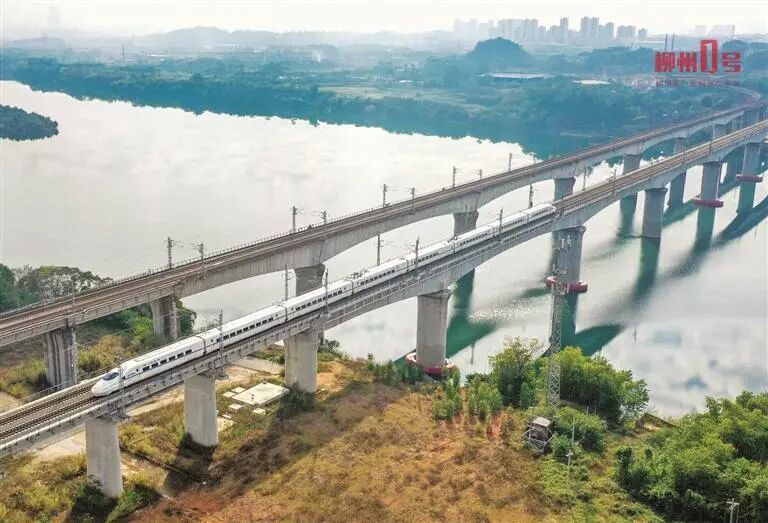 和諧號動車組列車從柳江雙線特大橋上駛過。 曾經,柳江雙線特大橋只是一座雙線客貨混跑鐵路大橋,即原衡柳線柳江雙線特大橋。為滿足運力需求,2021年開始在老橋旁新建另一座鐵路大橋,即新衡柳線柳江雙線特大橋,原橋則更名為鷓柳環(huán)線柳江雙線特大橋。 2023年10月16日的《柳州晚報》刊登了新建衡柳線柳江雙線特大橋主橋合龍的相關消息。2024年5月,開通后的衡柳線柳江雙線特大橋與鷓柳環(huán)線柳江雙線特大橋共同組成了柳江雙線特大橋,也讓該橋升級成一座包含兩條橋體、承載4條鐵路線路、客貨分運的鐵路大橋。