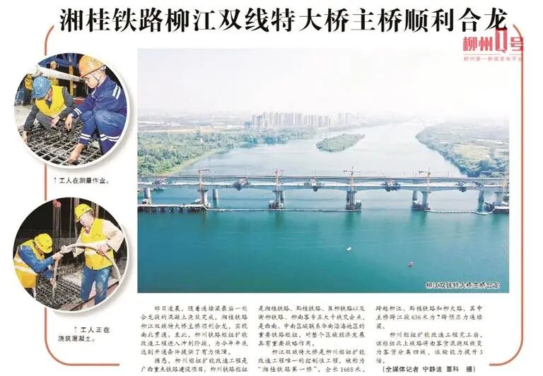 《柳州晚報》2023年10月16日刊登的衡柳線柳江雙線特大橋主橋順利合龍的相關圖文報道。
