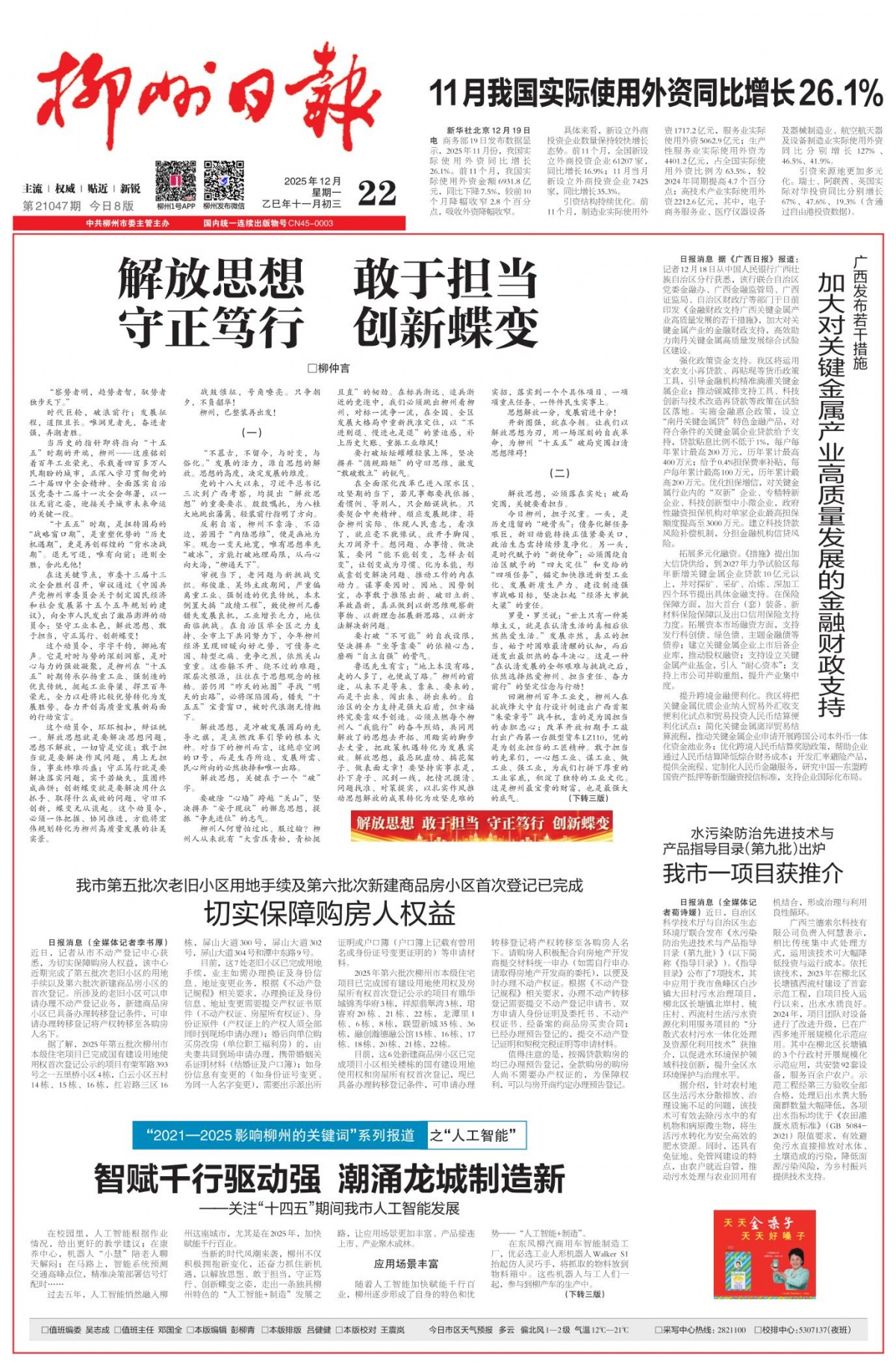《柳州日報》頭版頭條發(fā)表柳仲言文章。 “察勢者明,趨勢者智,馭勢者獨步天下! 時代巨輪,破浪前行;發(fā)展征程,道阻且長。唯洞見者先,奮進者強,弄潮者勝。 當歷史的指針即將指向“十五五”時期的開端,柳州——這座銘刻著百年工業(yè)榮光、承載著四百多萬人民期盼的城市,正深入學習貫徹黨的二十屆四中全會精神、全面落實自治區(qū)黨委十二屆十一次全會部署,以一往無前之姿,迎接關乎城市未來命運的關鍵一役。 “十五五”時期,是扭轉困局的“戰(zhàn)略窗口期”,是重塑優(yōu)勢的“歷史機遇期”,更是再創(chuàng)輝煌的“背水決戰(zhàn)期”。退無可退,唯有向前;進則全勝,舍此無他! 在這關鍵節(jié)點,市委十三屆十三次全會勝利召開,審議通過《中國共產黨柳州市委員會關于制定國民經濟和社會發(fā)展第十五個五年規(guī)劃的建議》,向全市人民發(fā)出了激昂澎湃的動員令:堅守工業(yè)本色,解放思想、敢于擔當,守正篤行、創(chuàng)新蝶變! 這個動員令,字字千鈞,擲地有聲。它是對時與勢的深刻洞察,是對心與力的強效凝聚,是柳州在“十五五”時期傳承弘揚重工業(yè)、強制造的優(yōu)良傳統(tǒng),挺起工業(yè)脊梁、捍衛(wèi)百年榮光,全力以赴將比較優(yōu)勢轉化為發(fā)展勝勢、奮力開創(chuàng)高質量發(fā)展新局面的行動宣言。 這個動員令,環(huán)環(huán)相扣,辯證統(tǒng)一。解放思想就是要解決思想問題,思想不解放,一切皆是空談;敢于擔當就是要解決作風問題,肩上無擔當,事業(yè)終難興盛;守正篤行就是要解決落實問題,實干若缺失,藍圖終成畫餅;創(chuàng)新蝶變就是要解決用什么抓手、取得什么成效的問題,守舊不創(chuàng)新,蝶變無從談起。這個動員令,必須一體把握、協(xié)同推進,方能將宏偉規(guī)劃轉化為柳州高質量發(fā)展的壯美實景。 戰(zhàn)鼓催征,號角嘹亮。只爭朝夕,不負韶華! 柳州,已整裝再出發(fā)! (一) “不慕古,不留今,與時變,與俗化!卑l(fā)展的活力,源自思想的解放。思想的高度,決定發(fā)展的維度。 黨的十八大以來,習近平總書記三次到廣西考察,均提出“解放思想”的重要要求。殷殷囑托,為八桂大地跳出藩籬、輕裝前行指明了方向。 反躬自省,柳州不靠海、不沿邊,若困于“內陸思維”,便是畫地為牢。觀念一變天地寬,唯有思想率先“破冰”,方能打破地理局限,從而心向大海,“柳通天下”。 審視當下,老問題與新挑戰(zhàn)交織。鄭俊康、吳煒主政期間,嚴重偏離重工業(yè)、強制造的優(yōu)良傳統(tǒng),本末倒置大搞“政績工程”,致使柳州幾番錯失發(fā)展良機,工業(yè)增長乏力,地位面臨挑戰(zhàn)。在自治區(qū)舉全區(qū)之力支持、全市上下共同努力下,今年柳州經濟呈現(xiàn)回暖向好之勢,可債務之困、轉型之痛、競爭之烈,依然關山重重。這些躲不開、繞不過的難題,深層次根源,往往在于思想觀念的桎梏。若仍用“昨天的地圖”尋找“明天的出路”,必將深陷困局,錯失“十五五”寶貴窗口,被時代浪潮無情拋下。 解放思想,是沖破發(fā)展困局的先導之旗,是點燃改革引擎的根本火種。對當下的柳州而言,這絕非空洞的口號,而是生存所迫、發(fā)展所需、民心所向的必然抉擇和唯一出路。 解放思想,關鍵在于一個“破”字。 要破除“心墻”跨越“關山”,堅決摒棄“安于現(xiàn)狀”的懈怠思想,提振“爭先進位”的志氣。 柳州人何曾怕過比、服過輸?柳州人從來就有“大雪壓青松,青松挺且直”的韌勁。在標兵漸遠、追兵漸近的競逐中,我們必須跳出柳州看柳州,對標一流爭一流,在全國、全區(qū)發(fā)展大格局中重新找準定位,以“不進則退、慢進也是退”的緊迫感,補上歷史欠賬、重振工業(yè)雄風! 要打破壇壇罐罐輕裝上陣,堅決摒棄“循規(guī)蹈矩”的守舊思維,激發(fā)“敢破敢立”的銳氣。 在全面深化改革已進入深水區(qū)、攻堅期的當下,若凡事都要找依據(jù)、看慣例、等別人,只會貽誤戰(zhàn)機。只要契合中央精神、順應發(fā)展規(guī)律、符合柳州實際、體現(xiàn)人民意志,看準了,就應毫不猶豫試、放開手腳闖、大刀闊斧干。想問題、辦事情、做決策,要問“能不能創(chuàng)變,怎樣去創(chuàng)變”,讓創(chuàng)變成為習慣、化為本能,形成靠創(chuàng)變解決問題、推動工作的內在動力。謀事要因時、因地、因勢制宜,辦事敢于推陳出新、破舊立新、革故鼎新,真正做到以新思維觀察新事物、以新理念拓展新思路、以新方法解決新問題。 要打破“不可能”的自我設限,堅決摒棄“坐等靠要”的依賴心態(tài),磨礪“自立自強”的骨氣。 魯迅先生有言:“地上本沒有路,走的人多了,也便成了路。”柳州的前途,從來不是等來、靠來、要來的,而是干出來、闖出來、拼出來的。自治區(qū)的全力支持是強大后盾,但幸福終究要靠雙手創(chuàng)造。必須點燃每個柳州人“我能行”的奮斗烈焰,共同用解放了的思想去開拓、用踏實的腳步去丈量,把政策機遇轉化為發(fā)展實效。解放思想,最忌玩虛功、搞花架子、做表面文章!要堅持實事求是,撲下身子、沉到一線,把情況摸清、問題找準、對策提實,以扎實作風推動思想解放的成果轉化為攻堅克難的實招,落實到一個個具體項目、一項項重點任務、一件件民生實事上。 思想解放一分,發(fā)展前進十分! 開新圖強,就