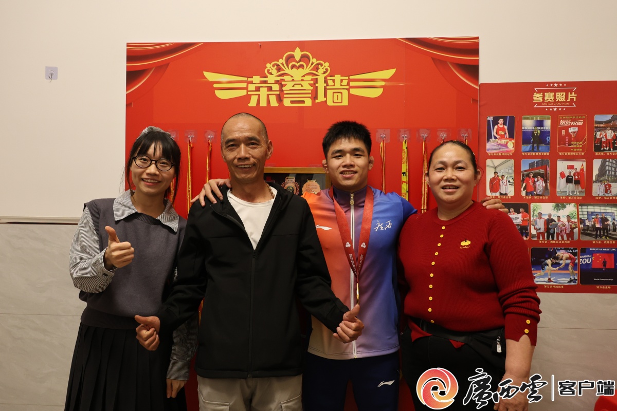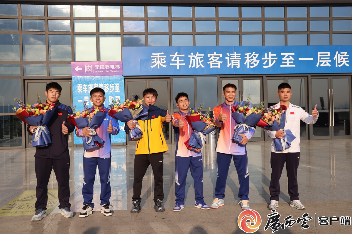 鄒萬豪、謝慶堪、李毅、何加云、鄒年湖、蔣英國6位優秀摔跤運動員一同回到賀州。張金蓮 攝 記者了解到,此次與鄒萬豪一同回到家鄉的還有謝慶堪、李毅、何加云、鄒年湖、蔣英國5位優秀摔跤運動員,他們均在國家級比賽中取得過優異成績。謝慶堪曾獲2024年全國U23國際式摔跤錦標賽男子自由式摔跤57公斤級金牌;李毅曾獲2023年全國國際式摔跤冠軍賽男子自由式摔跤74公斤級金牌;何加云曾獲2023年全國國際式摔跤冠軍賽男子自由式摔跤61公斤級金牌;鄒年湖曾獲2021年全國國際式摔跤錦標賽男子自由式摔跤61公斤級金牌;蔣英國曾獲2022年全國U17國際式摔跤錦標賽男子自由式摔跤92公斤級銅牌。 |