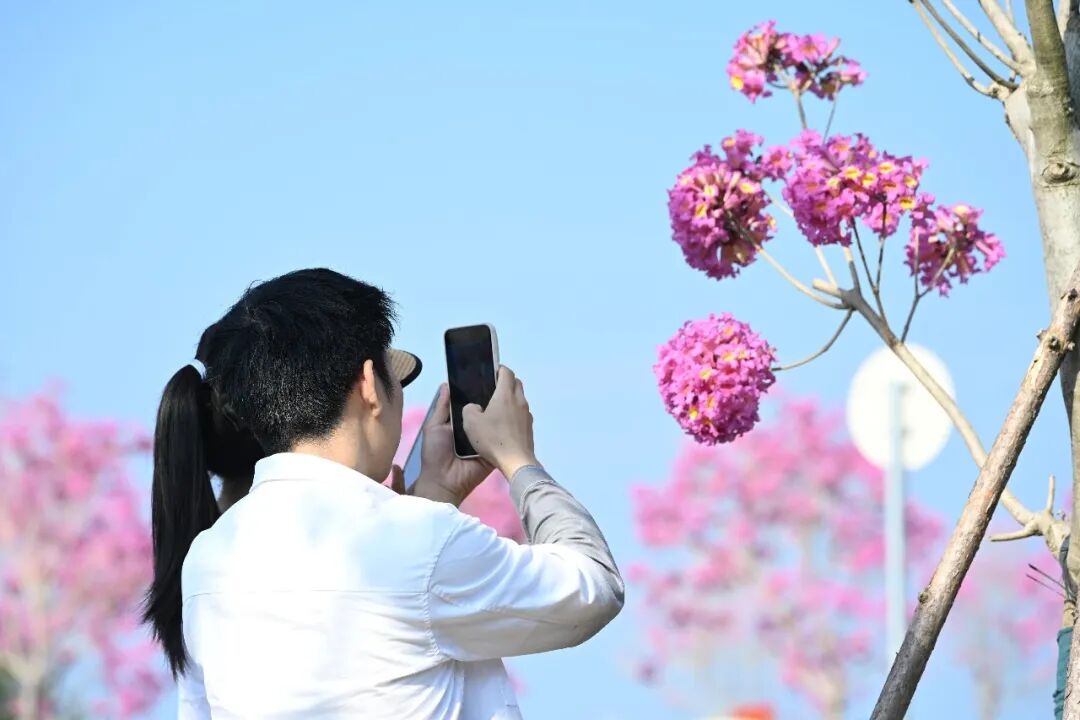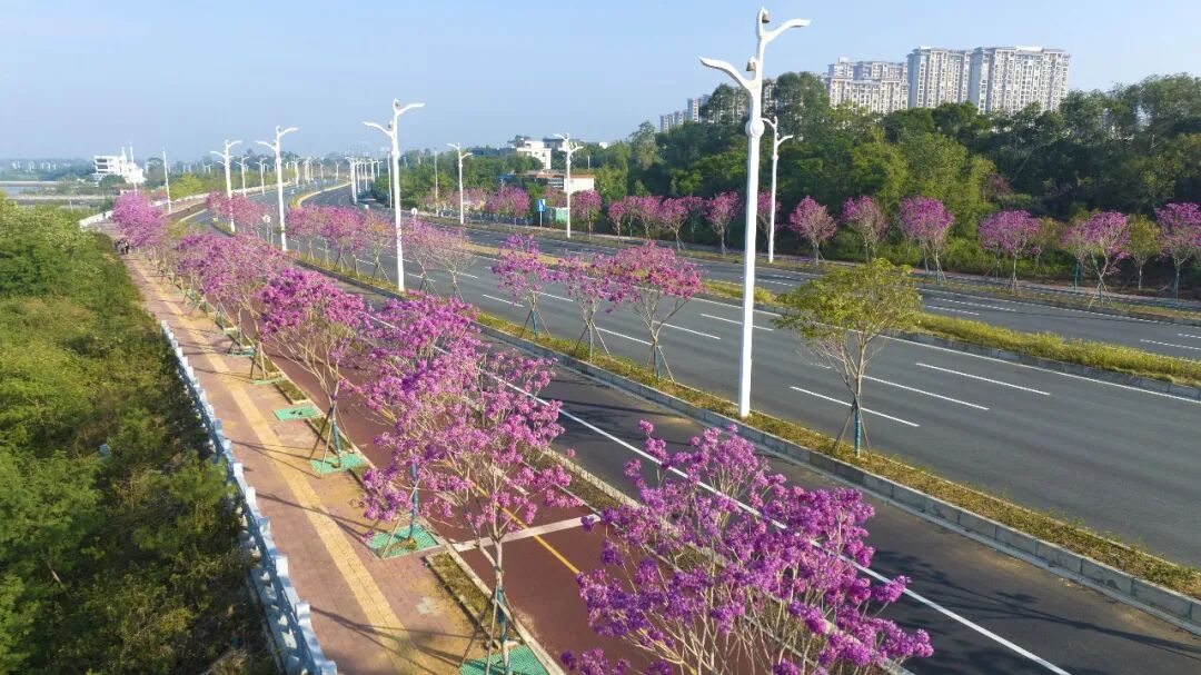 廉州灣大道沿線紫花風鈴木盛開,美不勝收。 據了解,該路段壯美景觀背后是精心的景觀布局。作為新晉網紅打卡地,廉州灣大道的紫花風鈴木尤為惹眼——2023年種下的512株苗木,歷經兩年精心養護迎來首次規模化盛放。11.19公里的北海—合浦段按景觀大道標準打造,是環島慢行系統重要部分。沿線種植紫花風鈴木、繡球花等多種花木;架空電纜入地讓景觀視野更通透,凸顯“觀景大道”定位。該路段配套了完善的慢行系統,全線慢行步道、自行車道和非機動車道一應俱全,其中臨海一側設4米寬、6.56公里長的專用自行車道,實現健身與賞景兼顧。