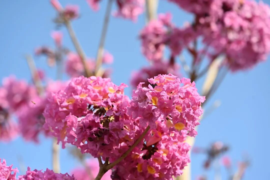 陽光下盛開正艷的紫花風鈴木。 據北海市園林部門介紹,截至目前,全市共種植紫花風鈴木約1600株,除廉州灣大道外,還分布在杭州路、銀灘三號路等區域,市民游客可趁晴好天氣前往這些路段漫游觀賞。 |