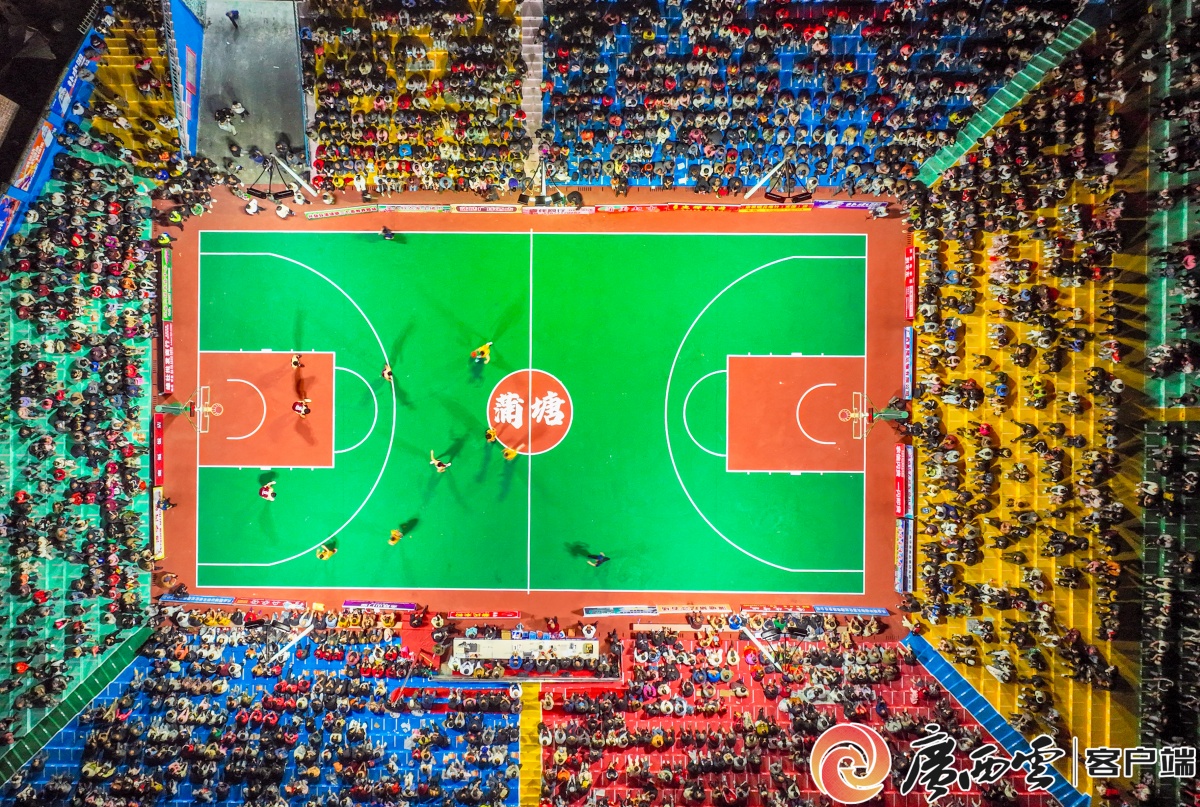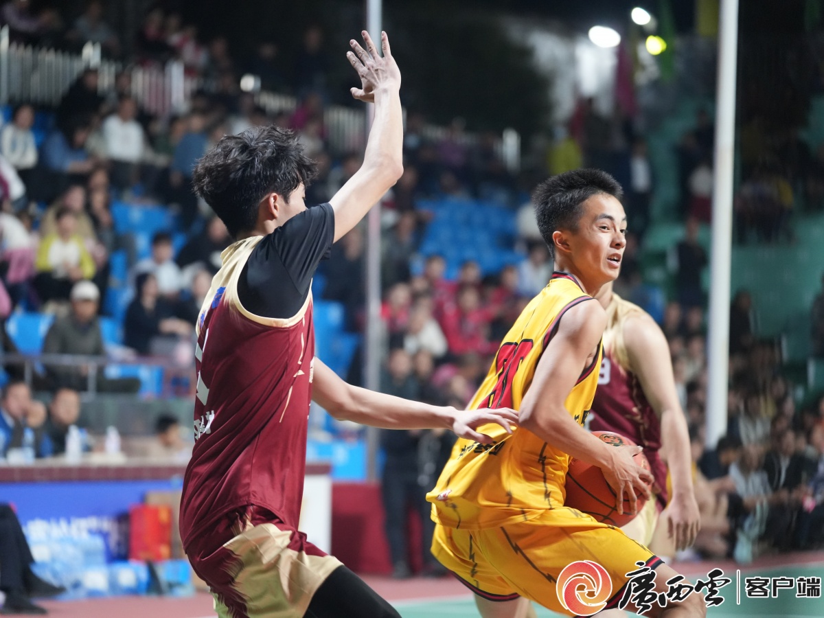 比賽中,球員們展現出強勁的拼搏韌勁。廣西云-廣西日報記者 張鈺斌 攝 19時,賽事開幕式正式開始。來自該鎮16個行政村的隊員們,提著裝滿了蒲塘米粉、砂糖橘、八角、沉香、五指毛桃等特色好物的竹編筐依次亮相,觀眾歡呼聲一浪高過一浪。首場賽事由石崎村對戰鳳文村隊。強強對話,吸引了超4000觀眾到場吶喊觀看。 這一夜,每個人都是賽事主角。賽場上,雙方隊員全力以赴,攻防轉換迅速、配合默契;賽場下,觀眾席上加油聲此起彼伏。觀眾中有白發蒼蒼的老人,有風華正茂的青年,也有天真活潑的孩子。