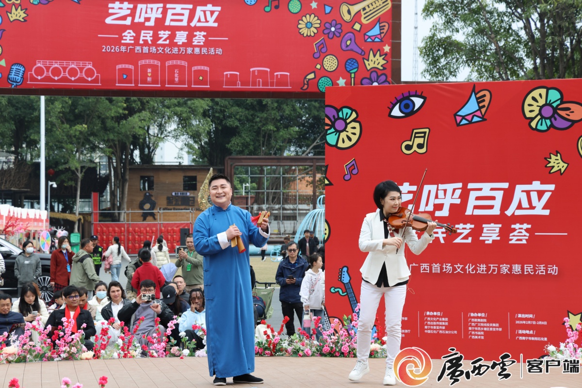 2月7日,由自治區(qū)黨委宣傳部、自治區(qū)文聯(lián)、廣西作協(xié)、自治區(qū)文化和旅游廳、廣西廣播電視臺(tái)共同主辦的“藝呼百應(yīng)”全民藝享薈——2026年廣西首場(chǎng)文化進(jìn)萬家惠民活動(dòng)在南寧市“新陽·石化里”美好生活街區(qū)精彩上演。