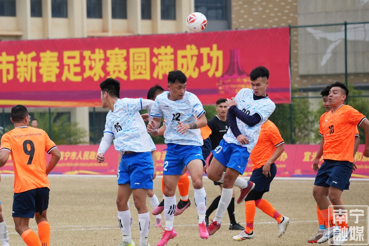 參賽球員在比賽中爭搶頭球。 7日的賽事開幕式后,越南海防市代表隊球員黃友輝表示,這是他第一次來到南寧參加比賽,非常期待與其他5支球隊有更深入的交流,通過比賽認識新朋友。“尤其期待與廣西隊的切磋,聽說目前廣西正在開展‘縣超’比賽,氛圍非常好,球員的水平也不低。”此外,黃友輝還表示南寧給他的印象非常深刻,滿城的綠樹,生態環境建設非常棒,賽事之余隊友們都說要在南寧游覽,感受這里美麗的城市景觀、獨特的人文氣息和豐富的文旅內容。